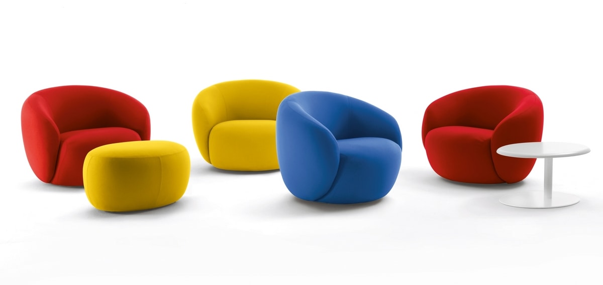 Série caractérisée par son dessin sinueux et enveloppant composée d’un fauteuil, d’un fauteuil tournant, d’un canapé deux places et d’un pouf. La série est d’un grand confort grâce à la générosité de ses dimensions et la haute résilience des rembourrages de l’assise et du dossier. Pour compléter et assortir la série nous proposons deux tables basses avec plateau elliptique, dont une en version tournante