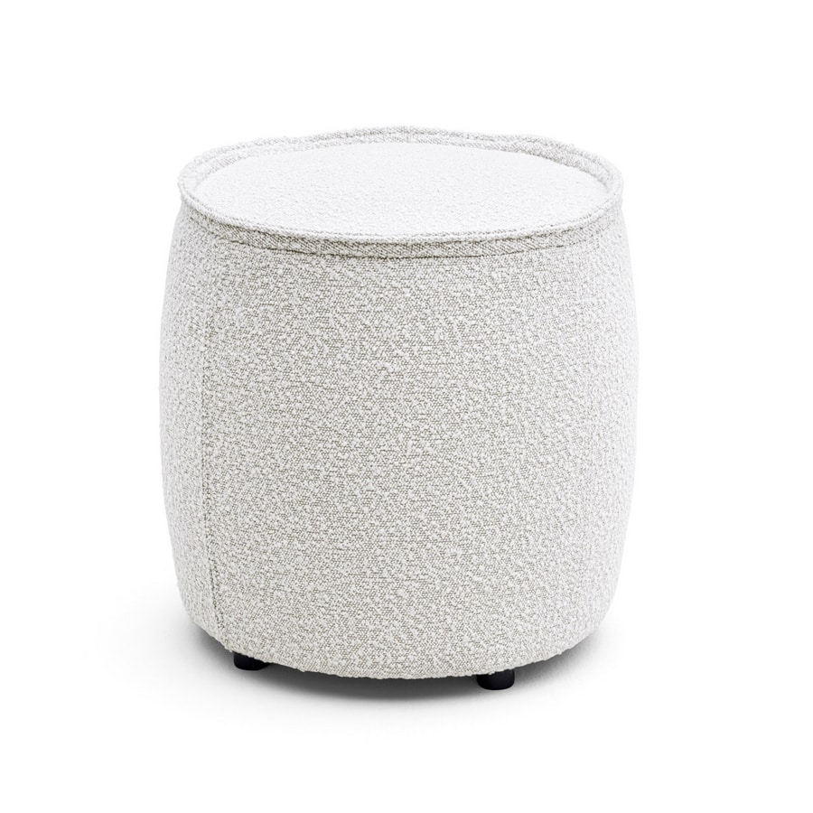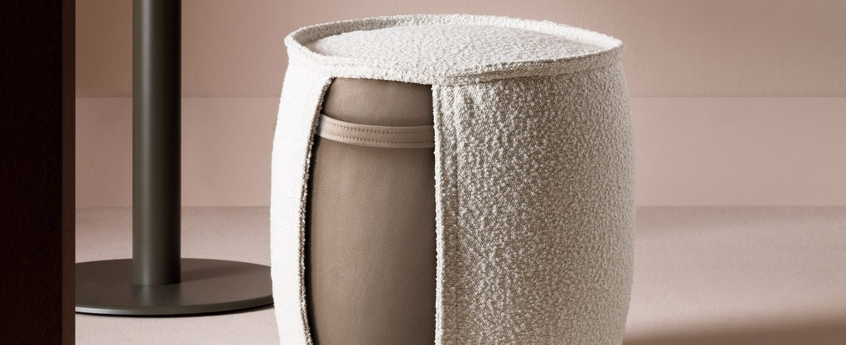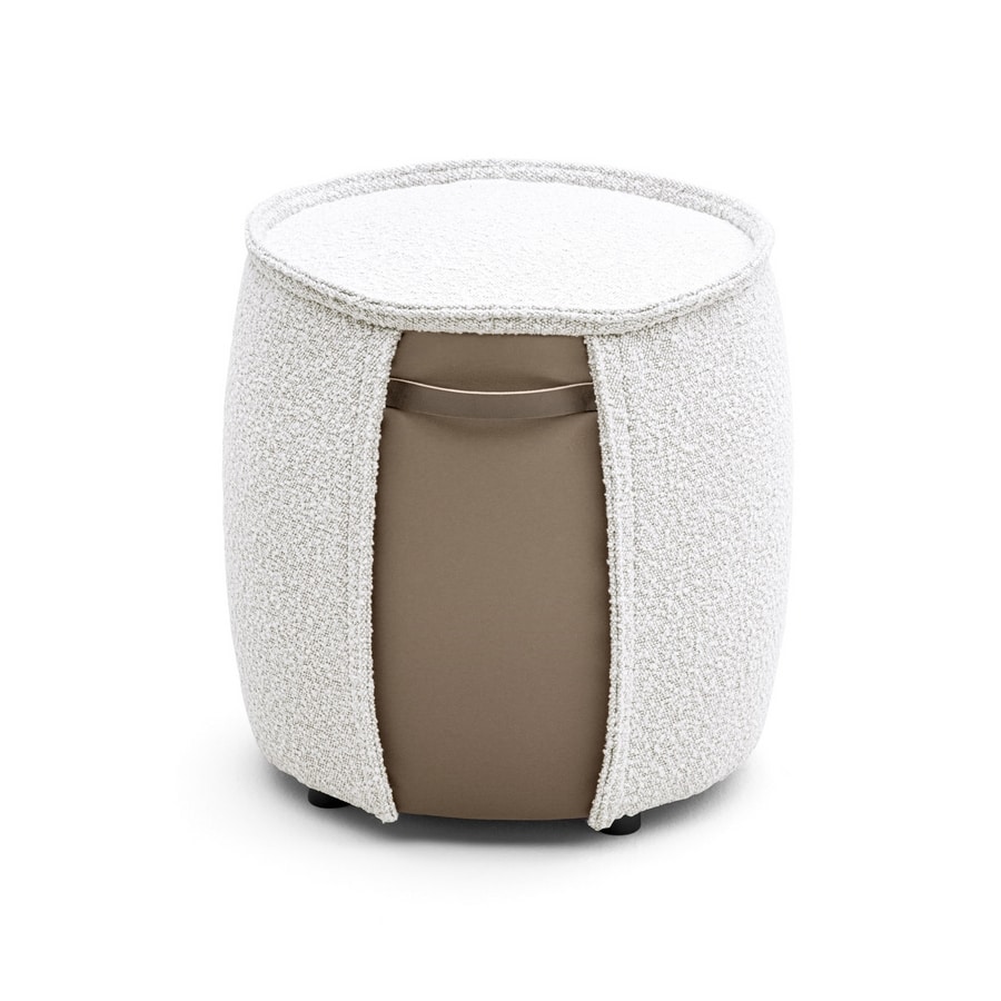 Pouf rond avec insert en tissu ou en cuir sur le côté et poignée en tissu ou cuir. Bordure spéciale saillante sur le bord supérieur de l'assise et dans l'insert. Pieds en plastique noir.