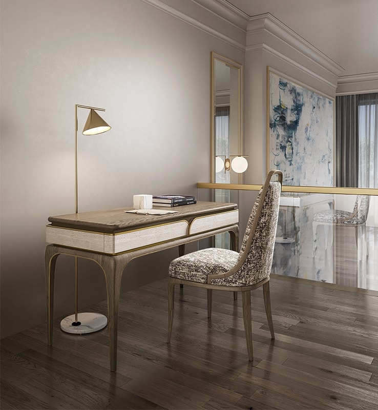 Bureau avec contreplaqué plaqué et MDF, piétement et base en bois de frêne massif, finition Santorini Sand. Profils en laiton bruni. Tiroirs à glissière.