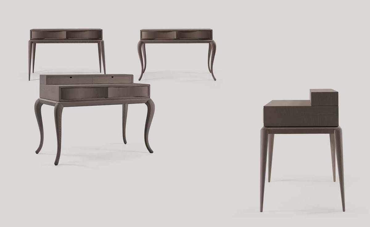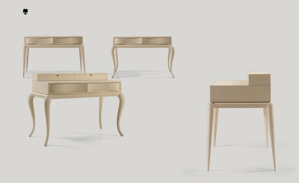 Élégance simple, conçue dans les moindres détails. Une forte personnalité pour le bureau Empire, ici dans la version frêne. Disponible avec et sans tiroirs supérieurs. Jambes coniques ou courbes.