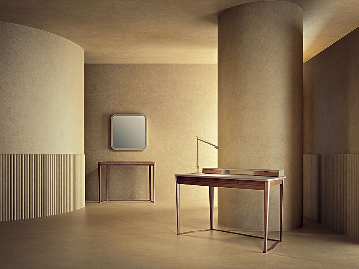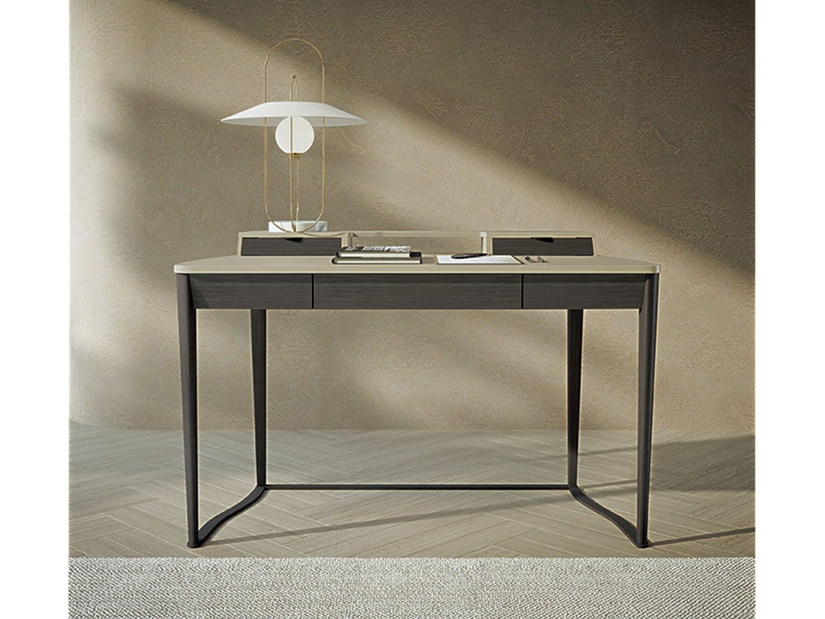 Bureau caractérisé par une ligne douce et légère. Grand tiroir avec mécanisme push and pull, petits tiroirs avec poignées en métal dans la partie supérieure. Façades des tiroirs en Tay foncé, pieds en bois massif dans la tonalité Tay foncé. Existe aussi en version Noyer Canaletta. Dessus recouvert de cuir, disponible en différentes couleurs.
