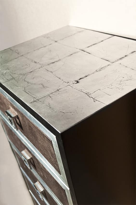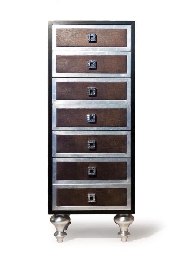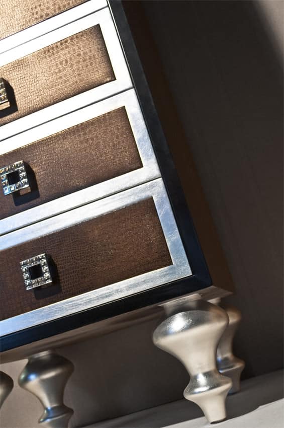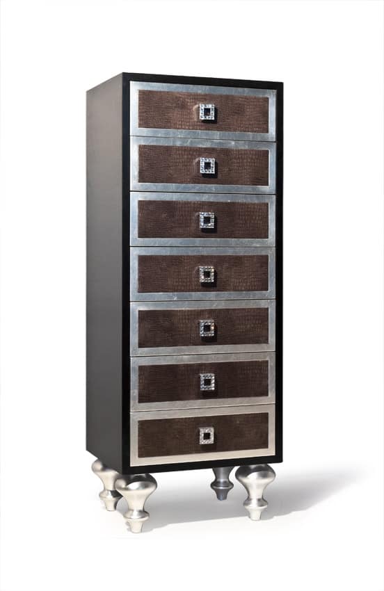 Commode en bois de hêtre. Finition: feuille noire et argent, tiroirs à l'avant recouvert de similicuir en crocodile, boutons Swarovski.
