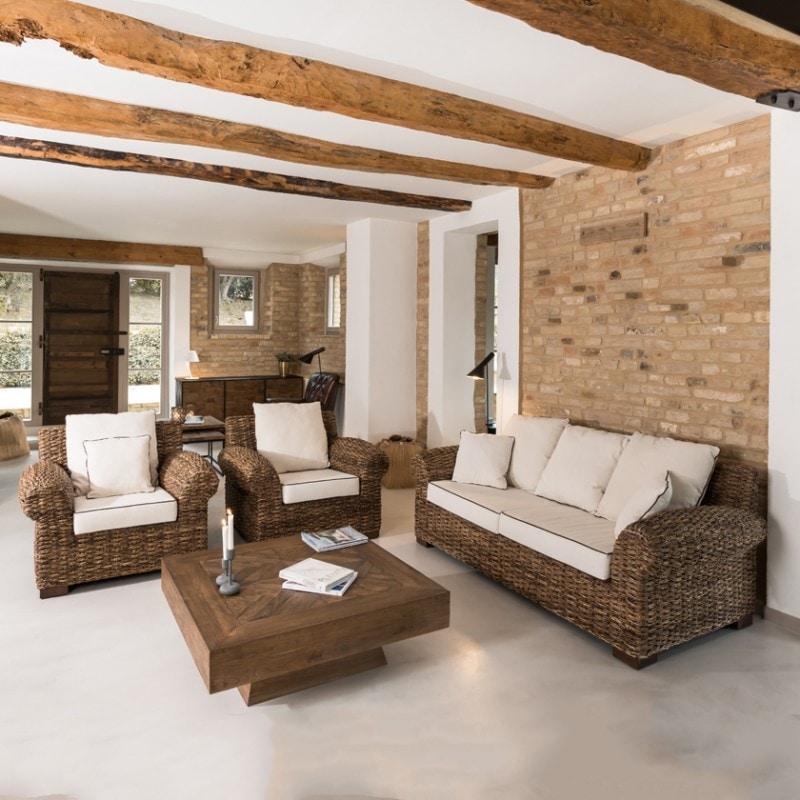 Ensemble de salon tissé à la main, en fibre naturelle de banano. Composé de 3 pièces: un canapé à 3 places, un canapé à 3 places, une table basse. La structure et le cadre sont en bois et en rotin. Coussins inclus (siège et dossier) dans un tissu barbelé en coton ECRU avec bordure de contraste de chocolat.