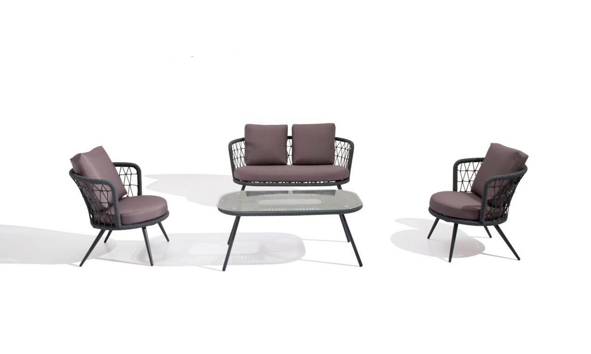 Cadre métallique peint pour l'extérieur, revêtement de corde tissé synthétique.