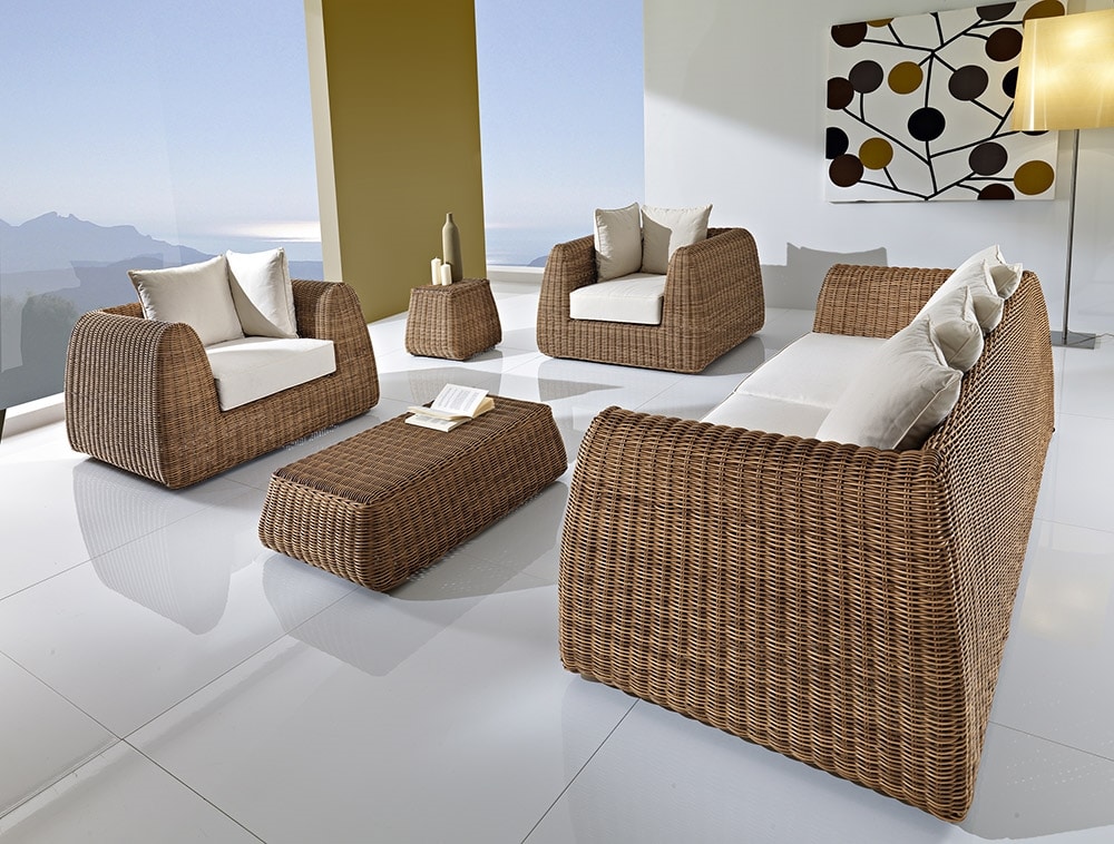 Ensemble de salon extérieur, avec une structure en aluminium recouverte de Polyrattan tissé, coussins blancs.
