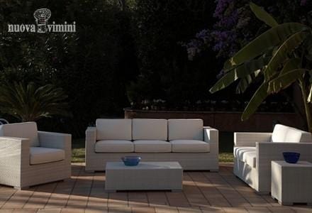 Salon en rotin synthétique, idéal pour une utilisation en extérieur. Finition en pierre blanche. La collection comprend un canapé 2 places et 3 places, un fauteuil, une table basse et un pouf.