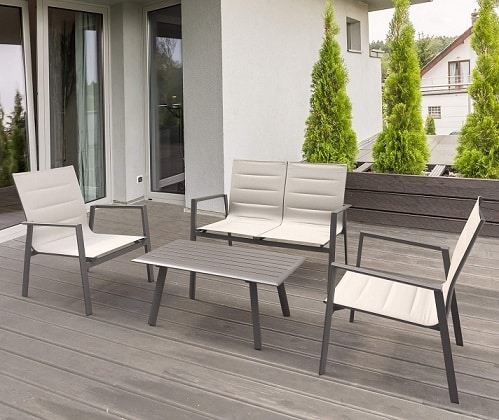 Ensemble de salon extérieur avec un design moderne. Structure en aluminium disponible en blanc, taupe ou anthracite. Siège de tissu dans Textilene rembourré.