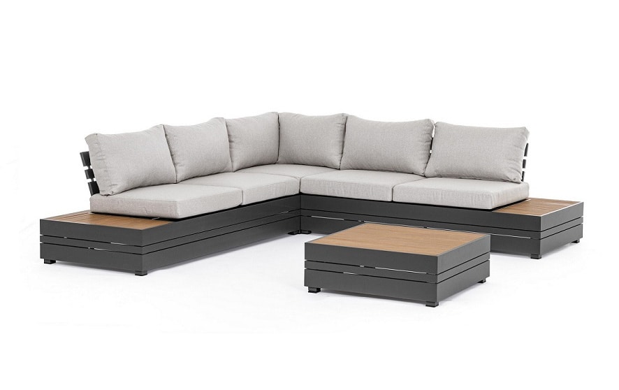 Canapé modulable avec structure en aluminium thermolaqué (polyester). Côtés et plateau de table en polywood (matériau composite à l'aspect du bois) 90% polystyrène 10% sbs coloris teck. Coussins déhoussables en tissu polyester. Vis en acier galvanisé. Dossiers à monter.