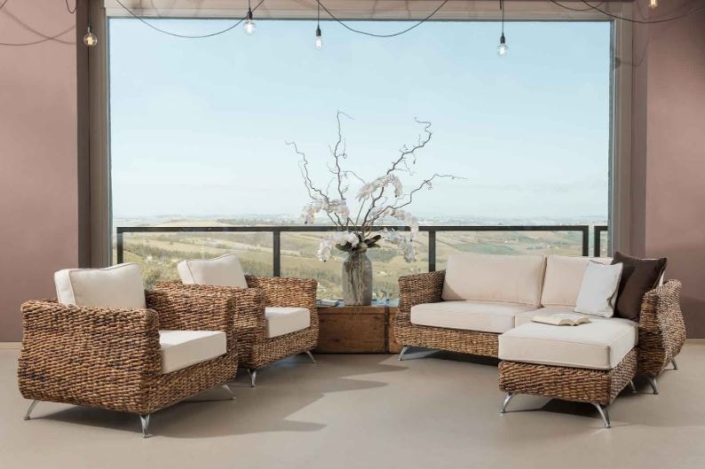 Cet ensemble de salon est tissé à la main dans la fibre naturelle de Banano. La structure et le cadre sont en bois et en rotin. Coussins inclus (siège et dos) dans le coton coton ecrù barbelé, amovible et lavable. La fibre de banane reste solide et robuste, 100 écologiques. Une finition avec une peinture d'eau transparente, offre une protection brillante et entrelacée.
