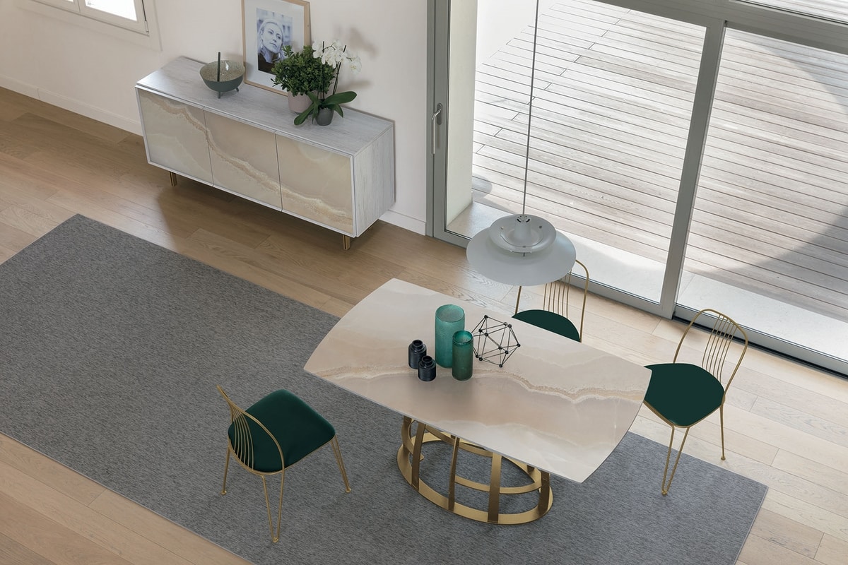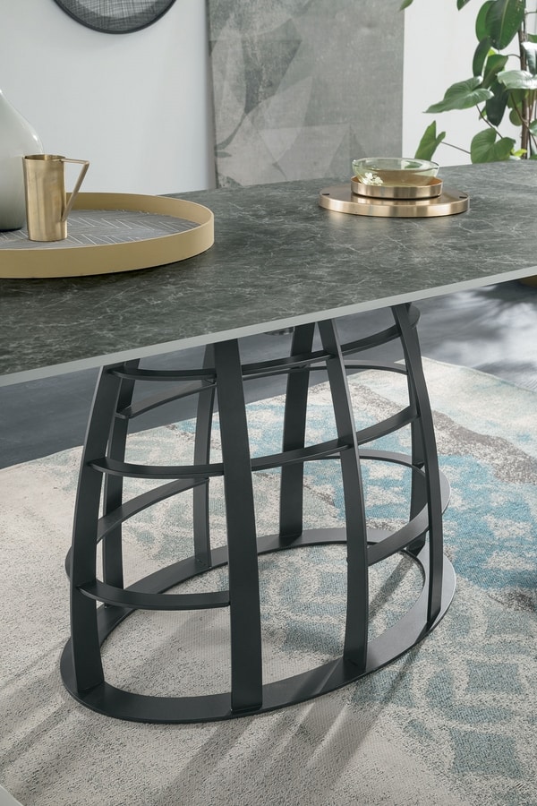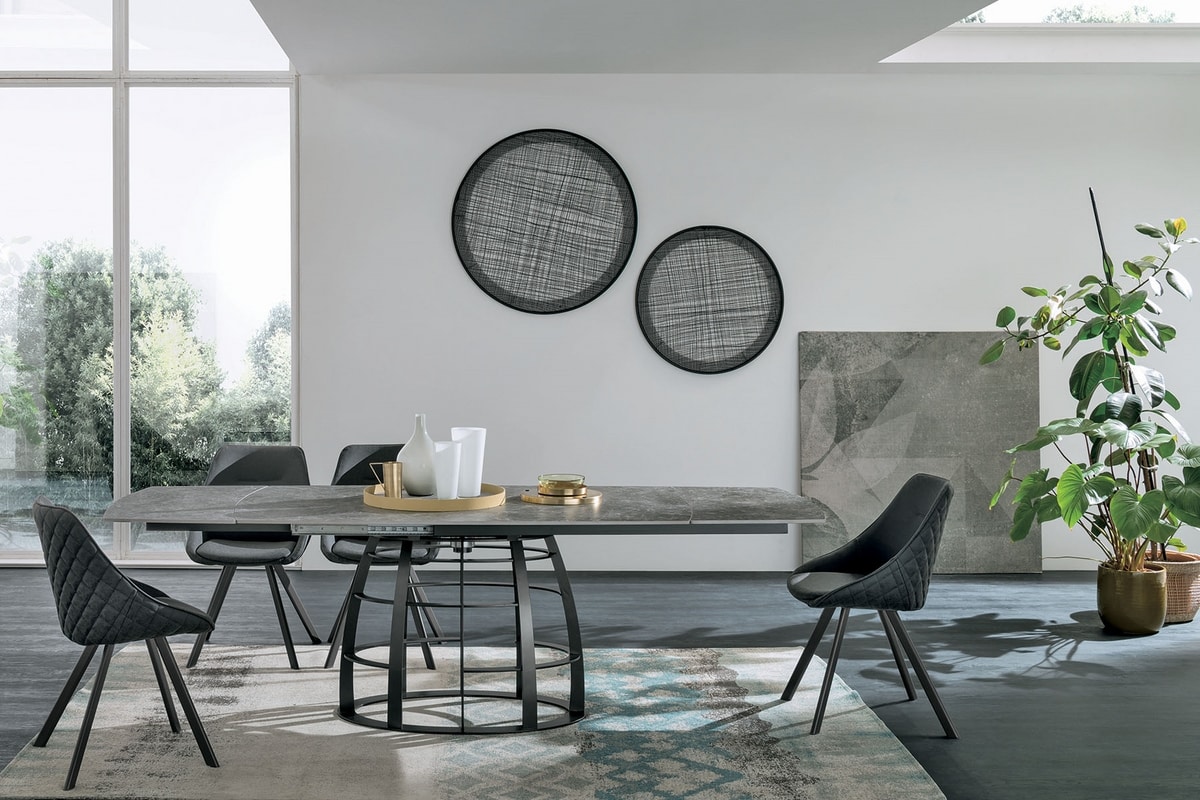 Table extensible avec piètement en fer peint. Plateau giratoire semi-automatique et allonges latérales en forme de tonneau en céramique ou en verre trempé avec impression digitale.