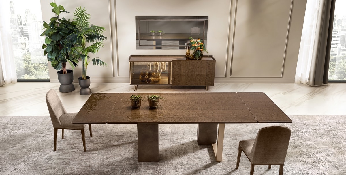 Les panneaux latéraux en bronze mat et les profils en or satiné de couleur champagne introduisent un contraste raffiné, soulignant les volumes et ajoutant une touche précieuse qui élève la sophistication globale de la collection.