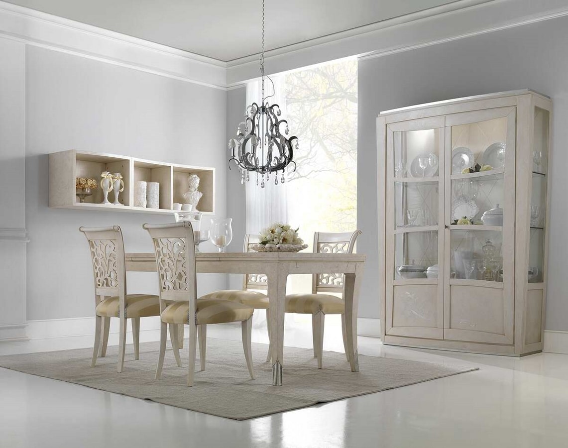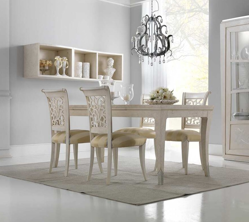 Demander prix Produits similairesTable à manger rectangulaire en bois laqué, avec décoration argentée. Avec un haut extensible.