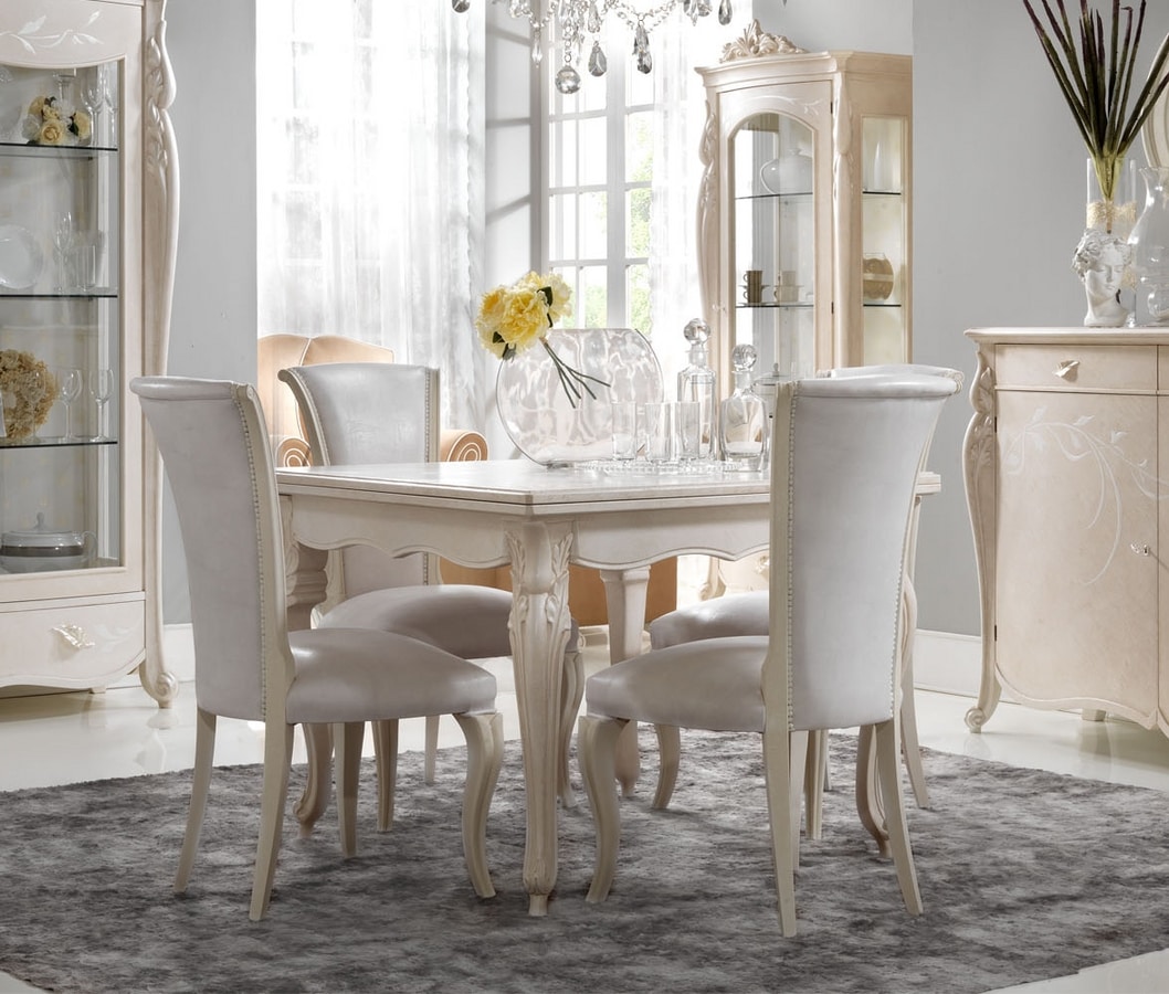 Table à manger en bois, avec haut extensible au carré. Finition laquée.