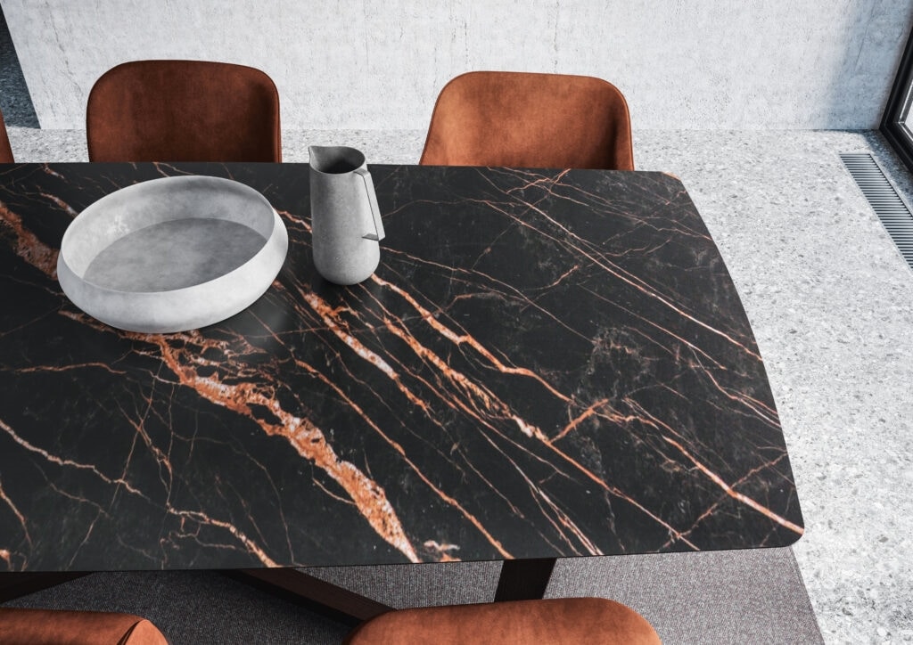 Table carrée, rectangulaire, courbe, ronde ou bien ovale; plateau également disponible avec bord biseauté à 45° et avec base de support à encastrement.