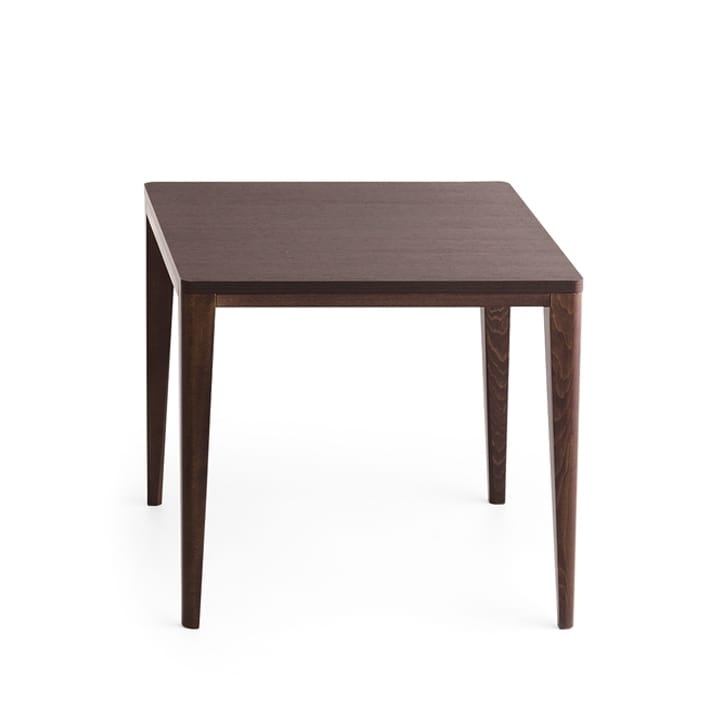 Table 80x80xH.76 cm avec 4 pieds carrés en bois massif. Chants extérieurs des pieds arrondis. Plateau en stratifié H.25 mm avec chant en ABS e 4 angles arrondis. Rails entre les pieds.