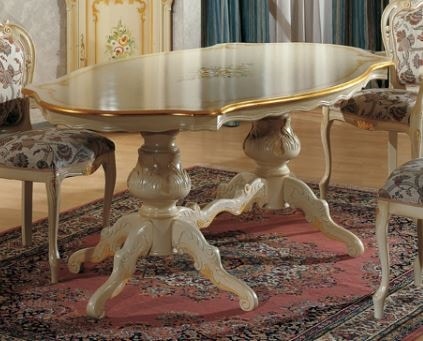 Table classique, avec plateau en forme. Socle finement sculpté. Peinture décorative sur le dessus.