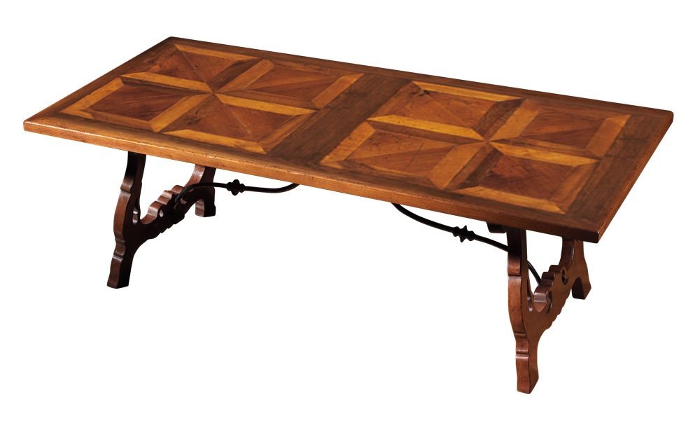 Table rectangulaire en noyer inspirée du style d'ameublement italien du XVIe siècle. Dessus agrémenté de deux panneaux antiques avec un motif d'incrustation géométrique polychrome, insérés dans un cadre à bord moulé. Les deux pieds en forme de lyre sont reliés au sommet par des traverses décoratives en fer forgé.