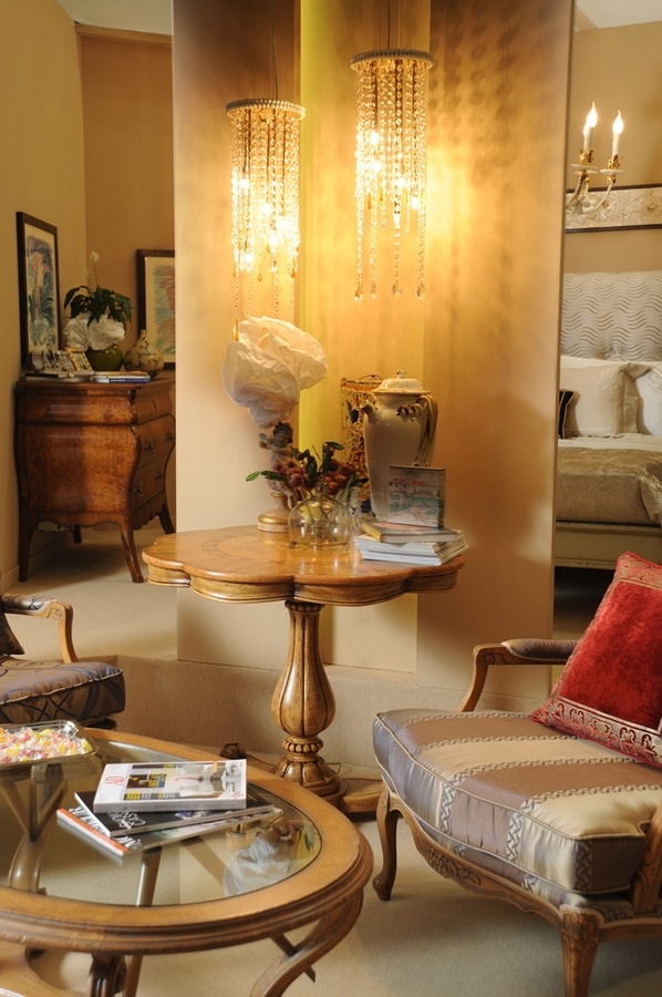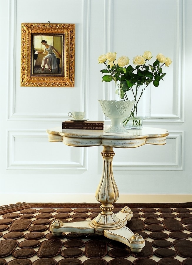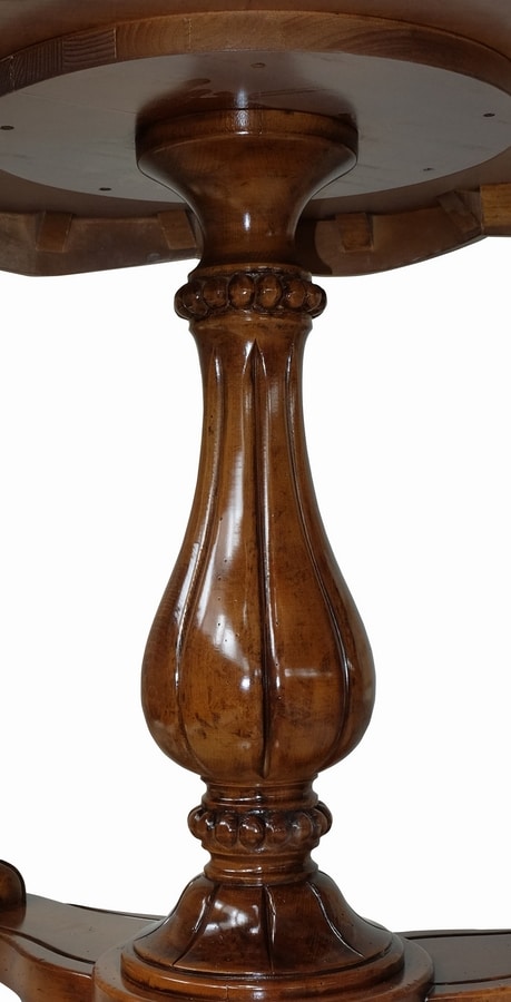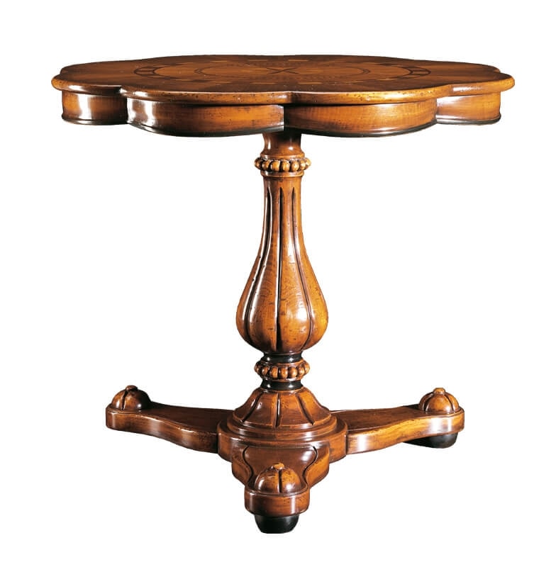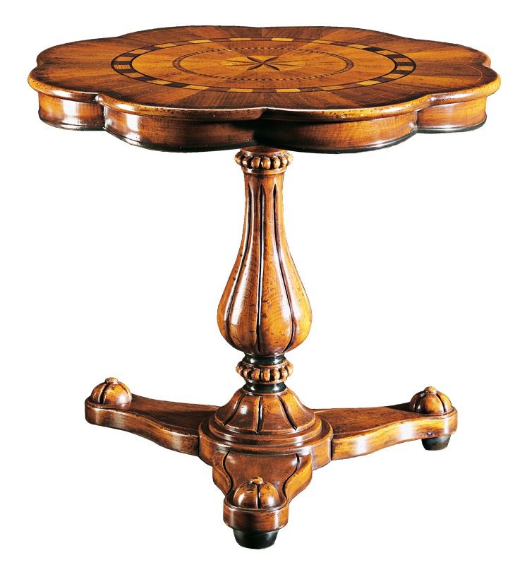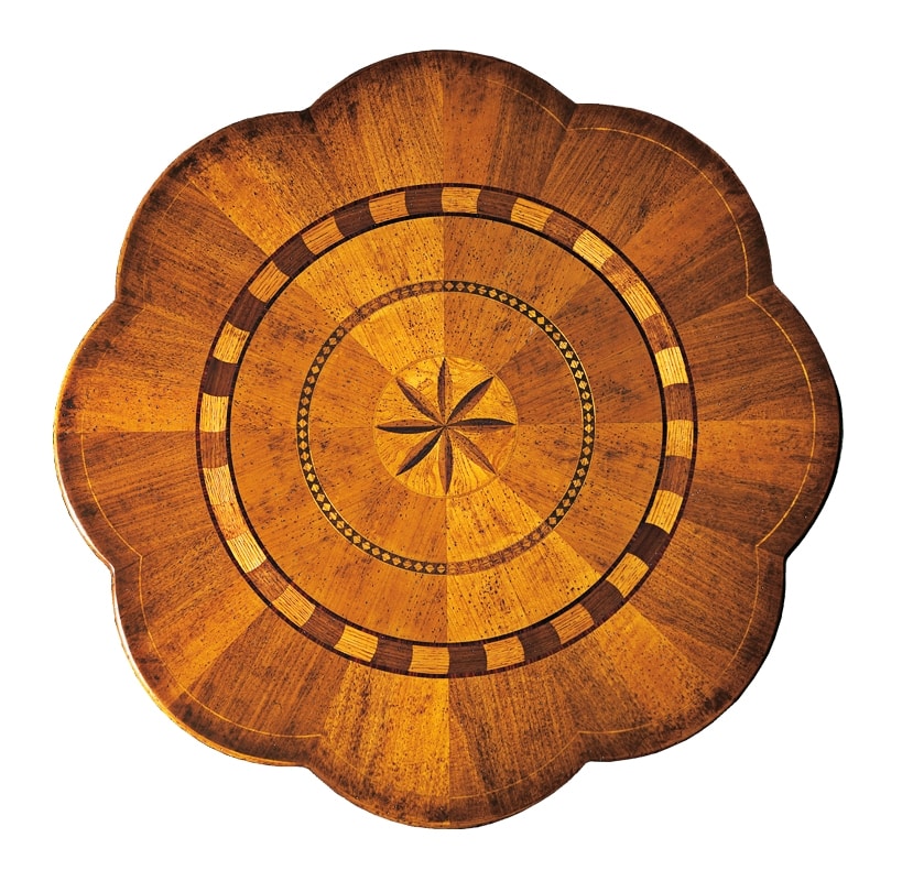 Table basse ronde en noyer, inspirée du style italien du XIXe siècle. Dessus avec bord formé avec des arcs et surface incrustée avec des bandes polychromes concentriques et un motif de marguerite central. Le plateau repose sur un seul support en forme de bulbe à rainure sur une base trilobée avec de petites pattes d'oignon.