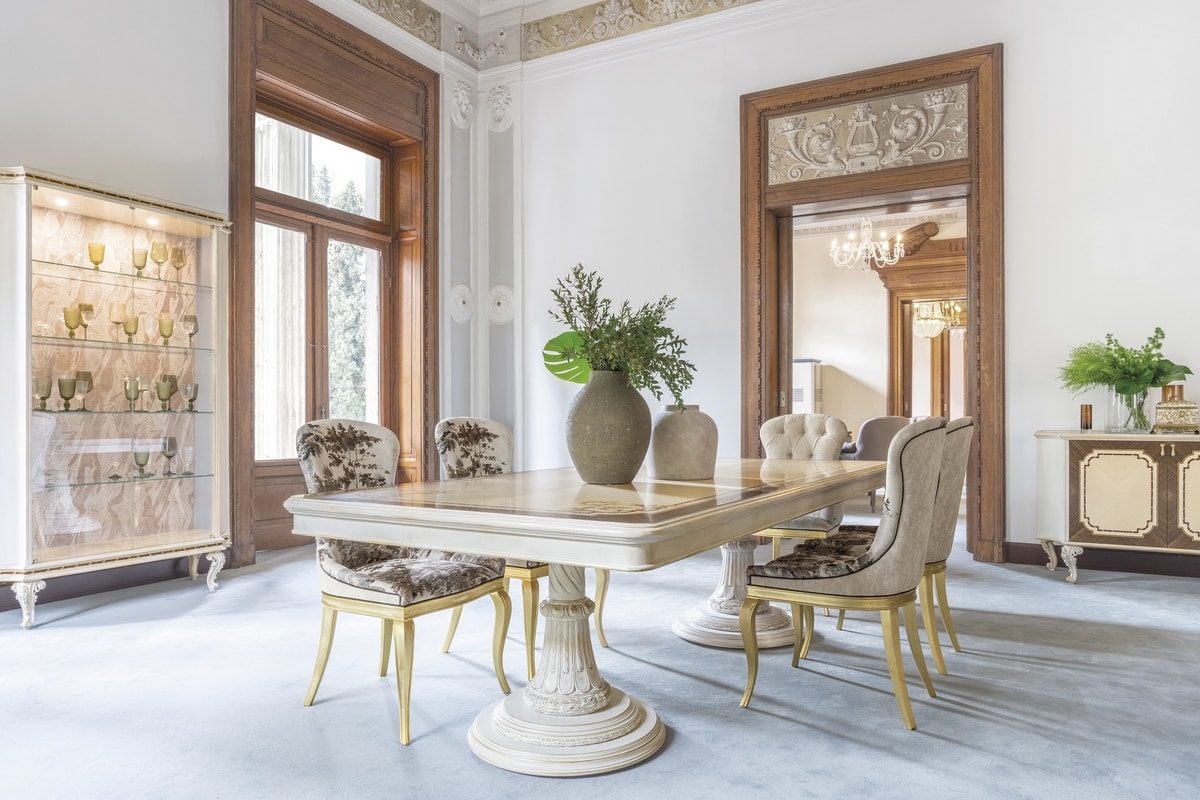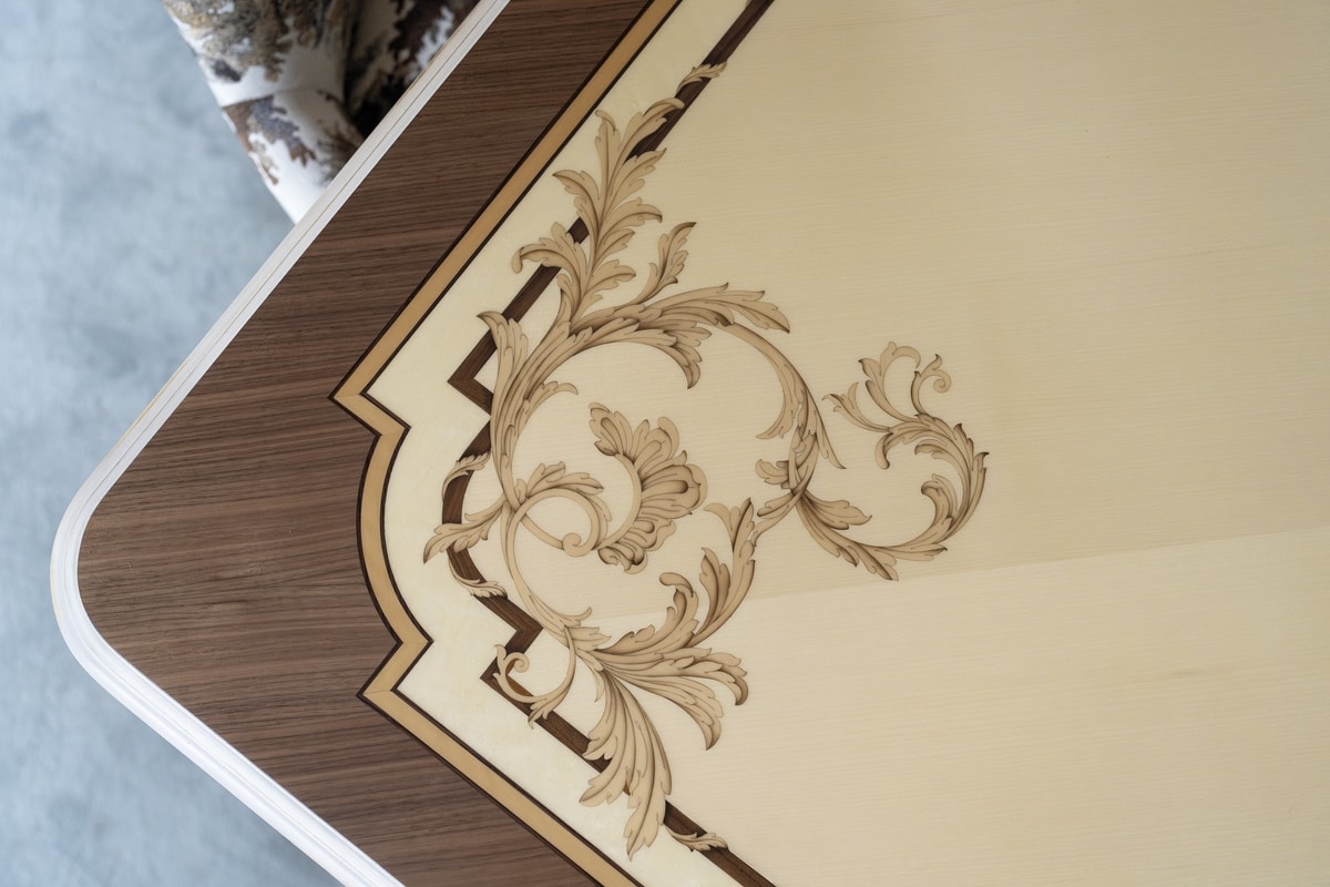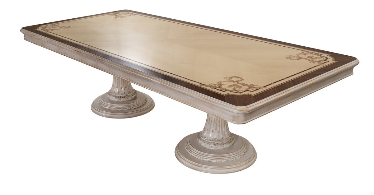 Table à manger avec jumelées en bois sculpté central, terminée à LAFM - Laquer de tempérament française en détresse en meringue blanche sur la feuille d'or. Le haut combine l'érable, le canaletto en noyer et les érables, enrichis d'une incrustation de poire et d'un motif de marquette décoratif en bois de rose, avec des feuilles de poire et de noix ombragées. Un chef-d'œuvre de l'ébéniste classique pour les intérieurs raffinés.