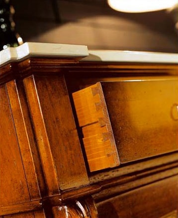 Table de chevet en noyer massif, reproduction de style 800. Dessus en marbre. L'intérieur des tiroirs a une finition en queue d'aronde.