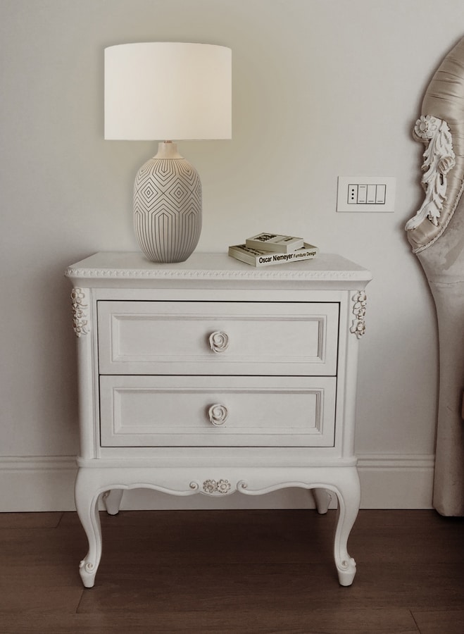 Table de nuit avec 2 tiroirs. Les formes élégantes, accentuées par les détails floraux, sont les traits distinctifs de cette commode et table de nuit. Fabriqués à la main en bois massif, ils disposent de tiroirs profonds. Fini en laque blanche avec des détails en feuille d'or.