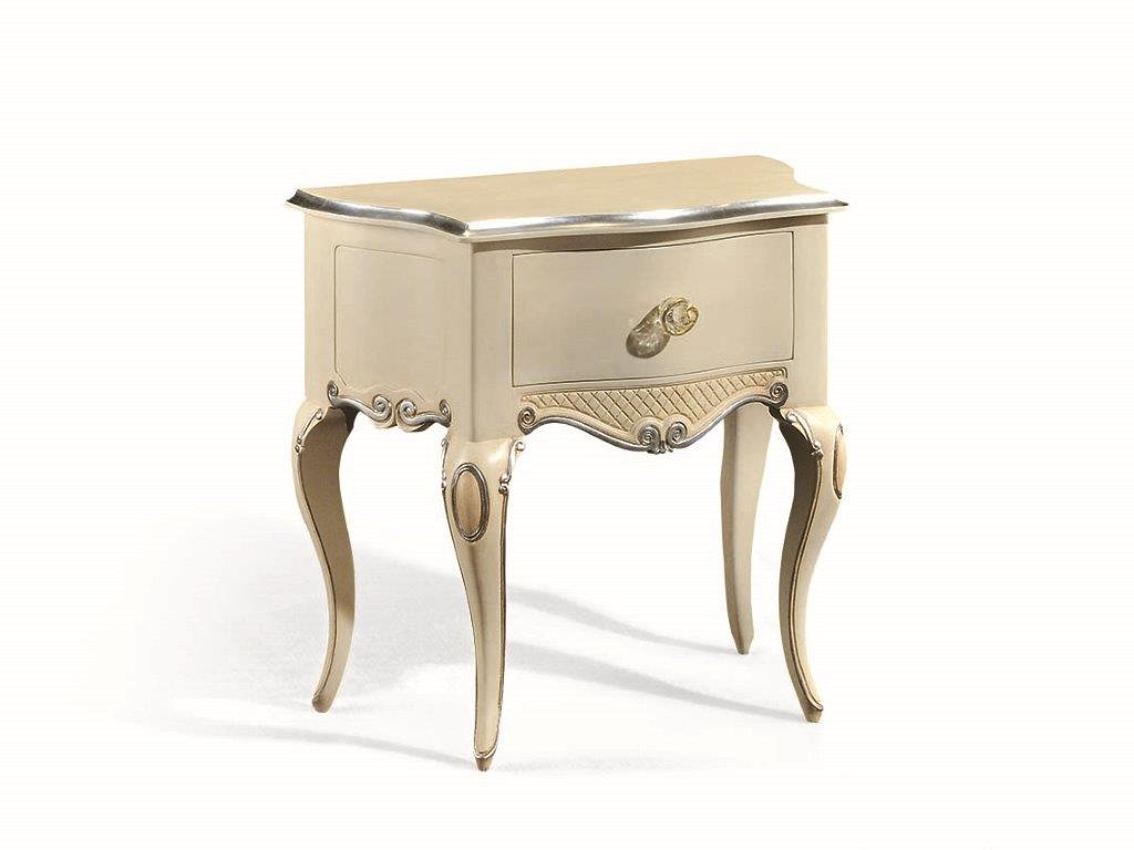 Table de chevet avec structure en bois massif, avec des sculptures et des embellissements d'argent, avec 1 tiroir, fait dans le style classique.