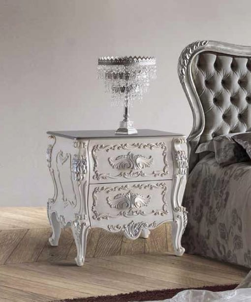 Table de chevet classique avec 2 tiroirs, riche en sculptures et travail rigoureusement fait à la main.