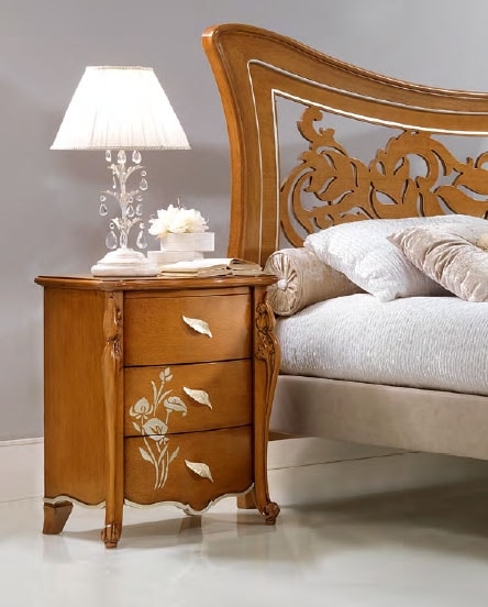 Demander prix Produits similairesTable de chevet de style classique, avec structure en bois, enrichie de sculptures. Poignées en argent. Équipé de 3 tiroirs.