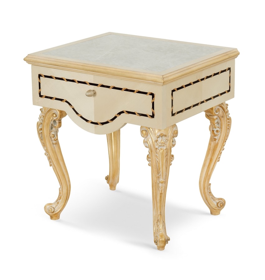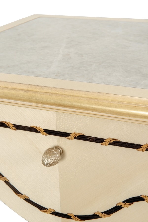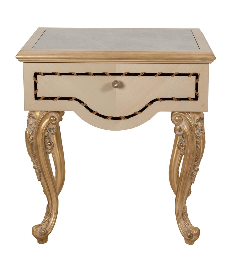 Nightand fine avec une structure d'érable, améliorée par des incrustations exquises dans le pin de Carolina et Pearwood ombragée. Les jambes finement sculptées s'harmonisent avec la feuille de finition Och sophistiquée -gold avec une patine blanche de meringue enveloppant la pièce entière. Le sommet, sans couture, est fabriqué à partir de marbre Taj Mahal, apprécié pour son éclat naturel et ses délicates nuances chromatiques.