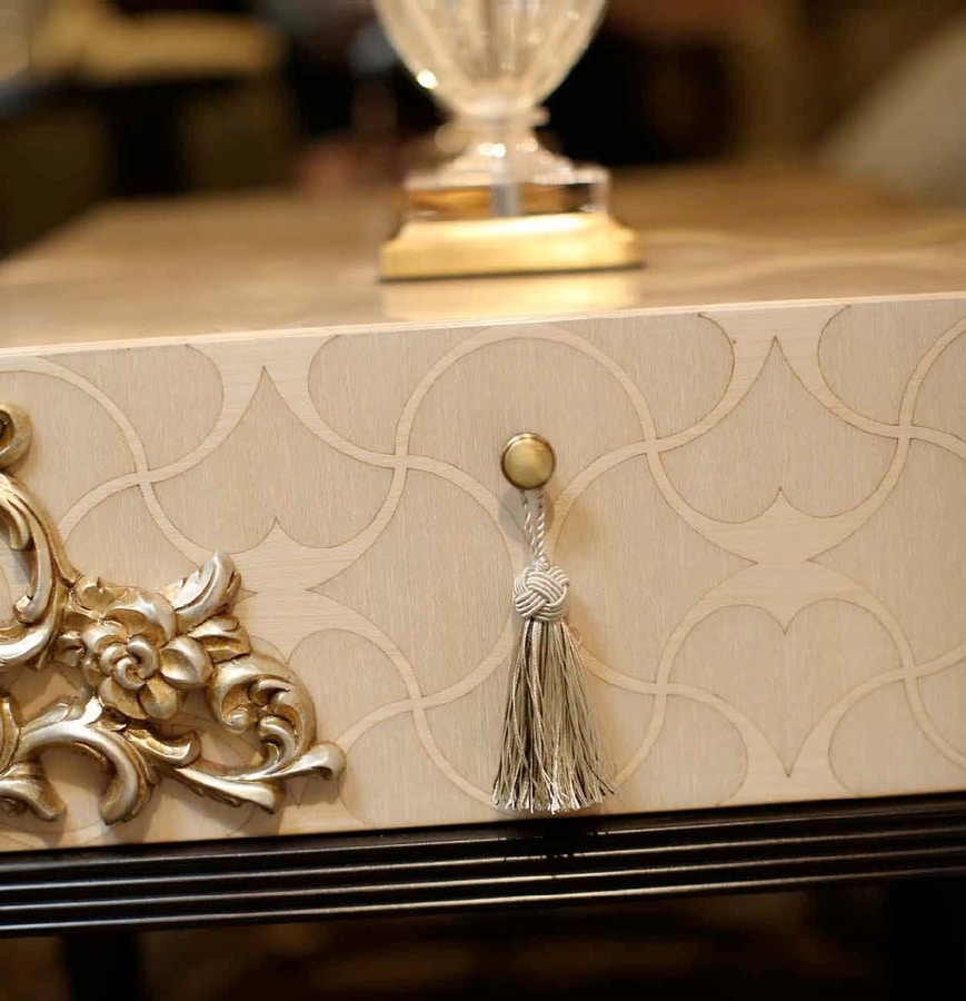 La structure en chêne est teintée d'une laque marron foncé et liée par un précieux décor en orrone satiné; le tiroir est plaqué avec des incrustations Kotò et équipé de guides Blum avec dispositif de fermeture amortie.