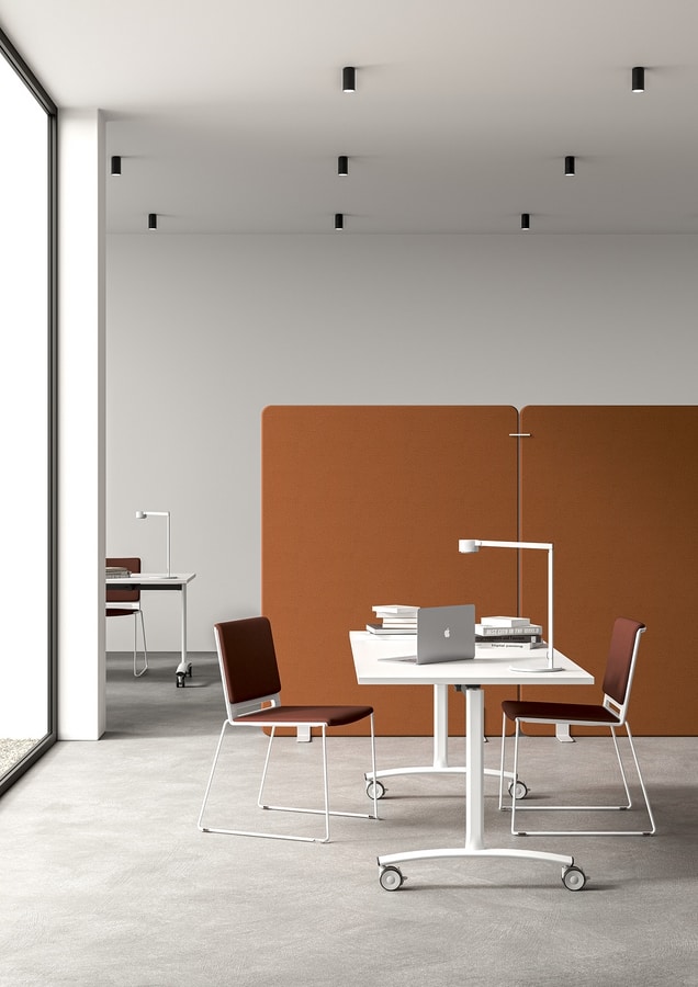 Caractérisé par une flexibilité hors du commun, ce modèle permet de combiner deux tables pour n’en créer qu’une, de forme ronde et au design distinctif. Archimede sur roulettes avec plateau rabattable est parfaite pour meubler les espaces d’entreprise où la polyvalence est stratégique, tels que les salles de réunion, de conférence, de formation ou multimédia. Le modèle d’Archimede constitue également une solution efficace et élégante pour le télétravail et permet de transformer la maison en un espace bureau contemporain.