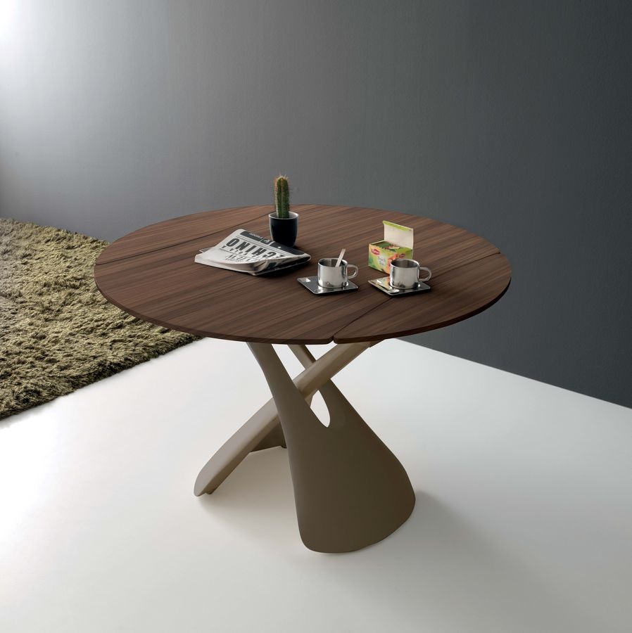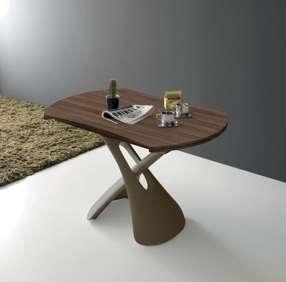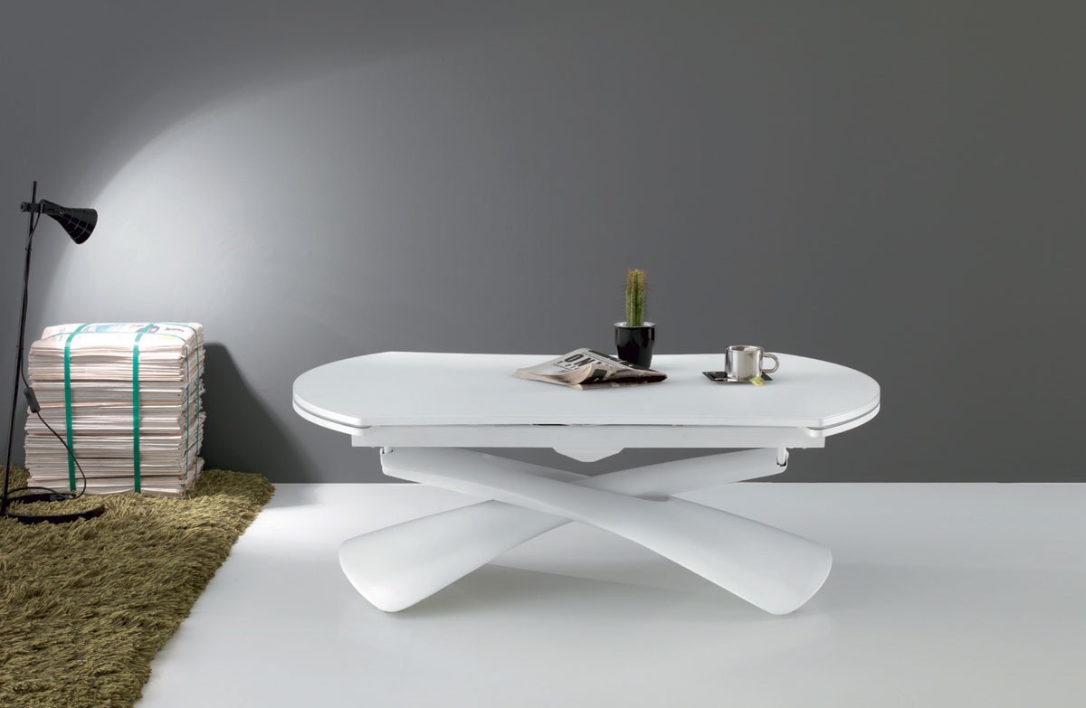 Table ouvrable et relevable, base en polyuréthane laqué blanc opaque. Plateau rectangulaire irrégulier transformable en rond, disponible en mdf laqué blanc brillant ou stratifie gris anthracite, verre opaque blanc ou verre gris cendre collé sur support mdf.