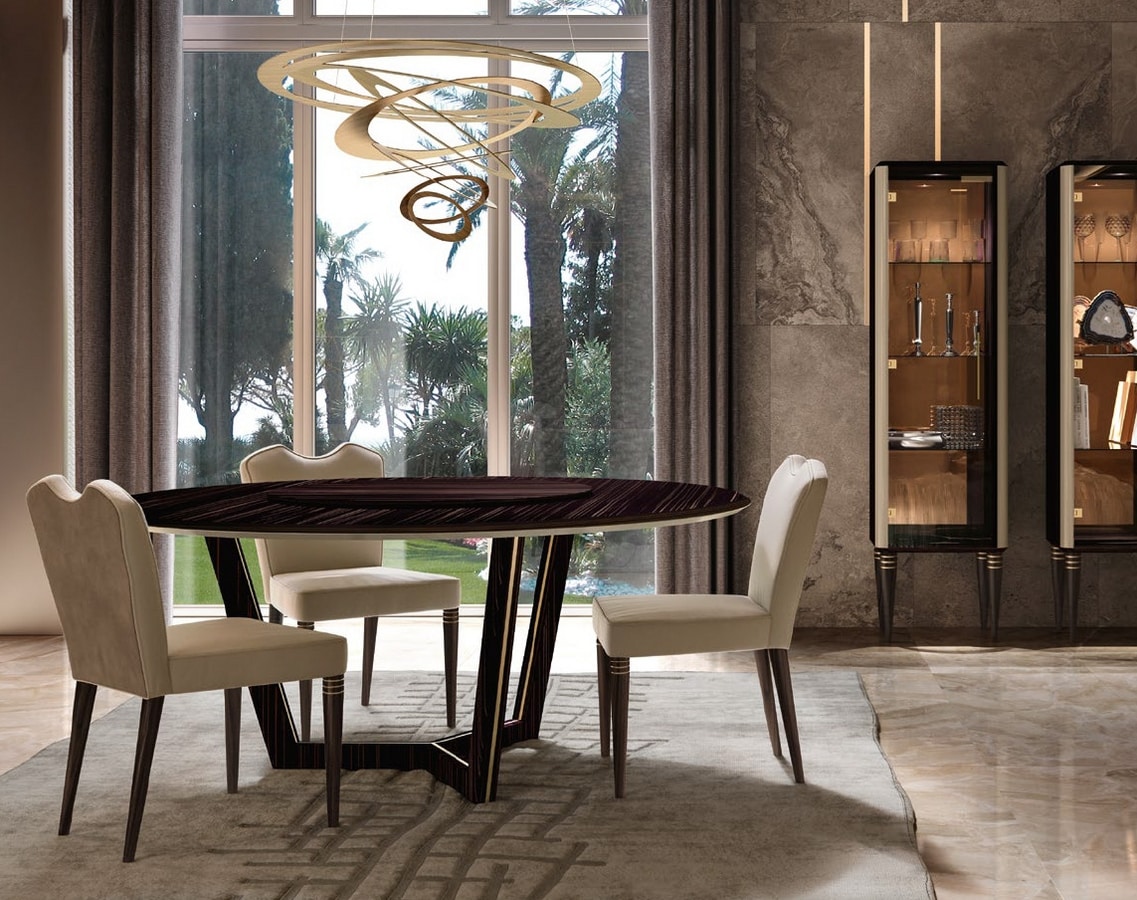 Autoritaire et cosy à la fois, l'espace de vie est un hymne à la convivialité et au bien-être. La table, ronde ou rectangulaire, présente un précieux plateau sombre en placage d'ébène qui s'agence avec classe à la console, tandis que l'espace détente se distingue par sa sobriété et son confort.