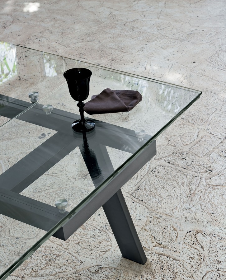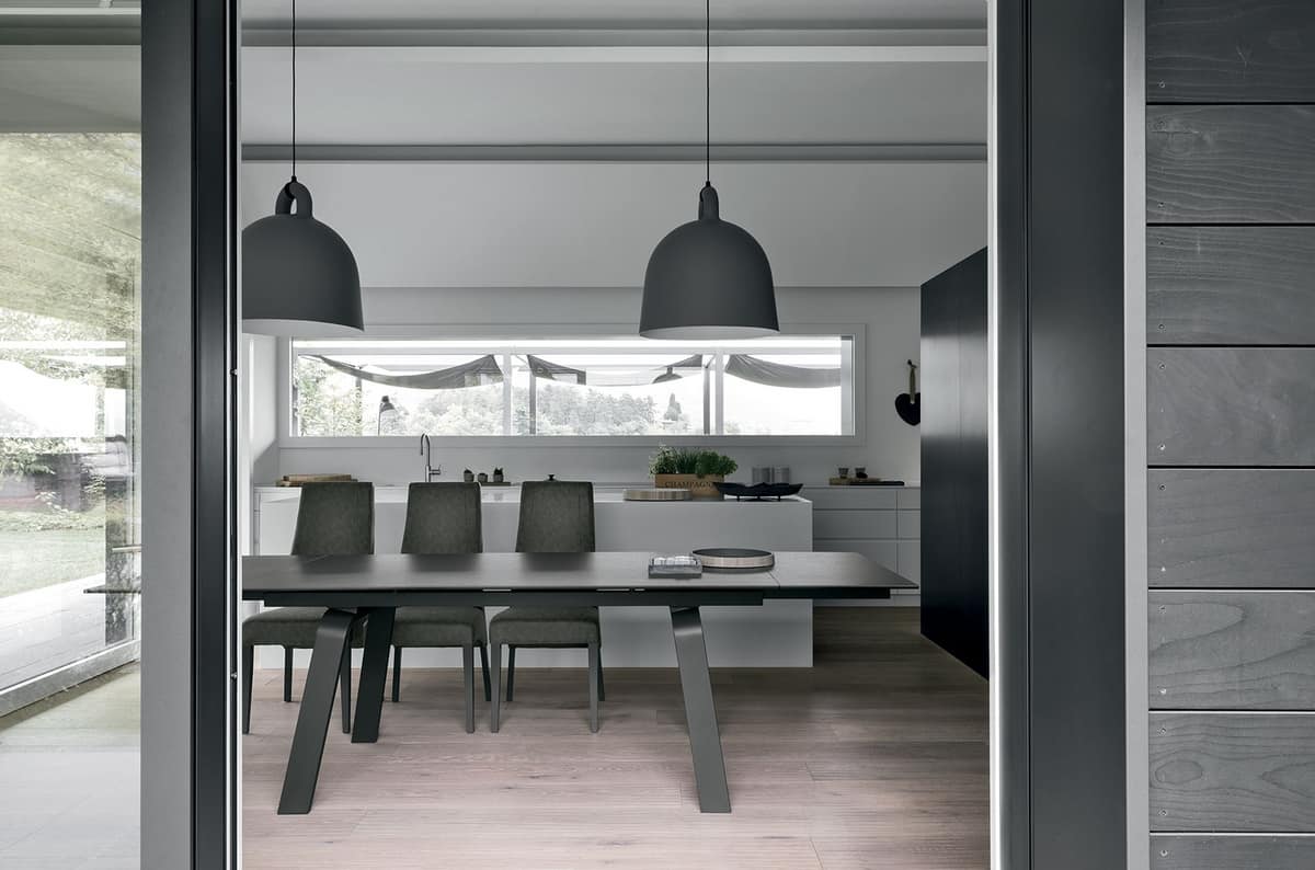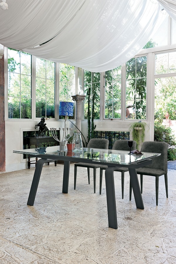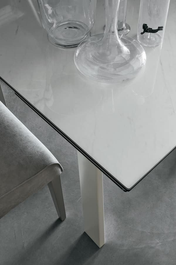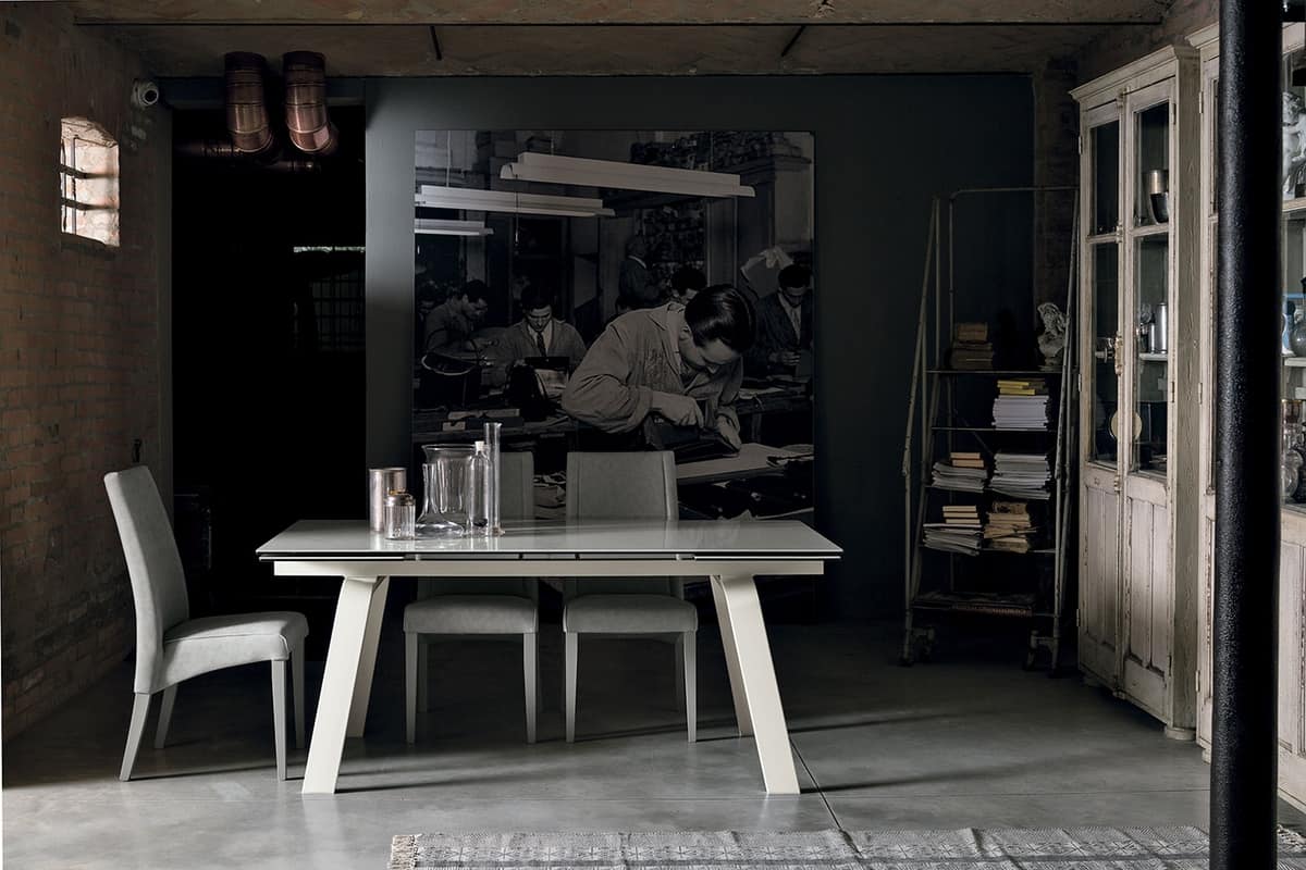 Table extensible avec structure en métal peint ou en bois. Plateau rectangulaire et rallonges latérales symétriques en ceramique ou verre trempé.