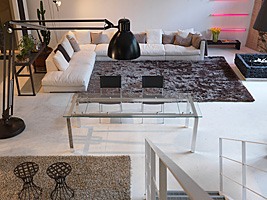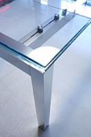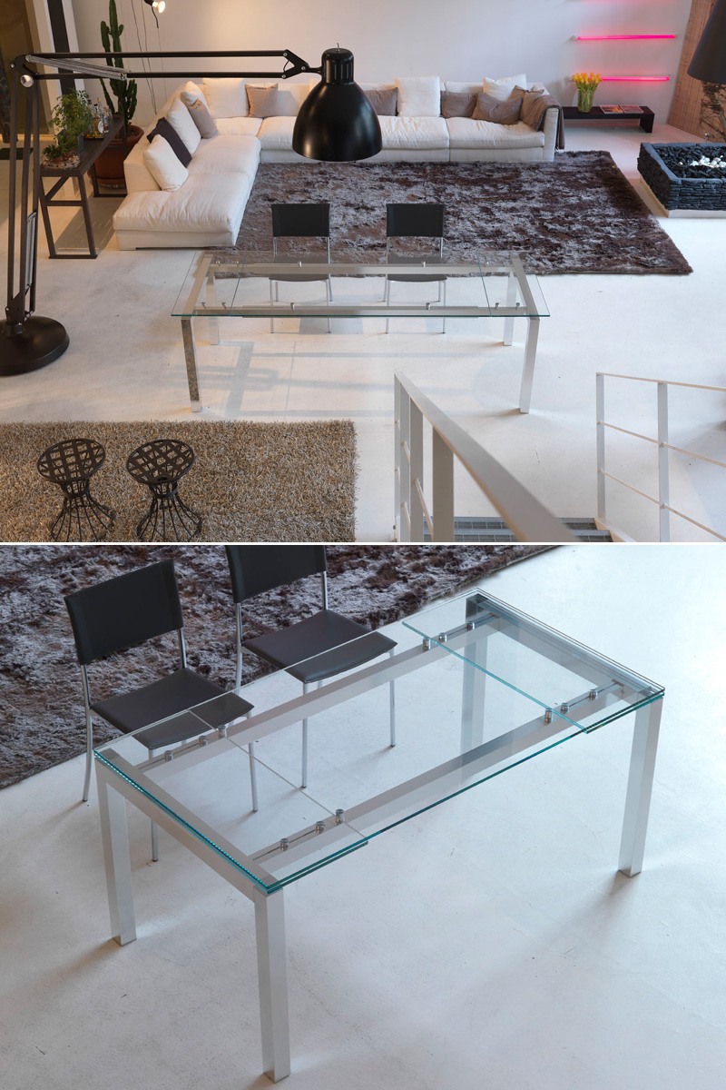 Table à manger extensible des deux côtés, avec une structure en aluminium et des guides de barbue, ou avec une structure en métal laqué et aluminium émaillé guides. Plan central et extralight chat trempé transparent. «P» d'extension de 10mm d'épaisseur de verre.