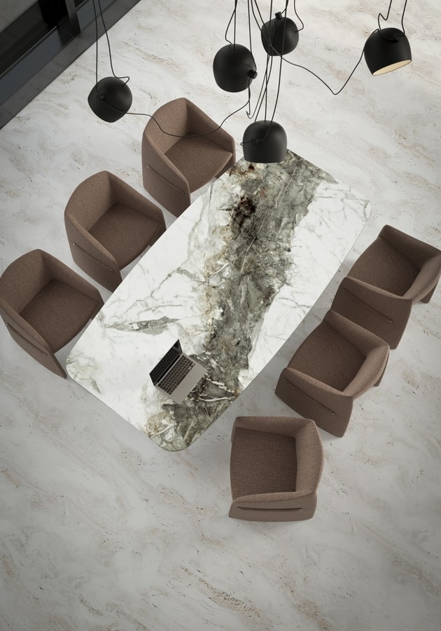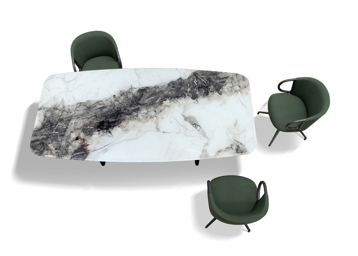La collection Twirli incarne l'équilibre parfait entre matériaux précieux et design sophistiqué. La table se distingue par la base revêtue de cuir, qui ajoute une touche de raffinement tactile, et le plateau en verre sérigraphié, qui donne légèreté et luminosité à l'ensemble. Conçue pour des environnements exclusifs de l'hospitalité, Twirli combine esthétique et fonctionnalité, transformant chaque espace en une expérience de design intemporel.