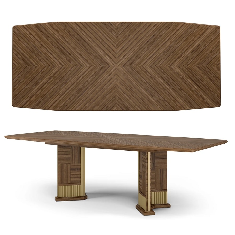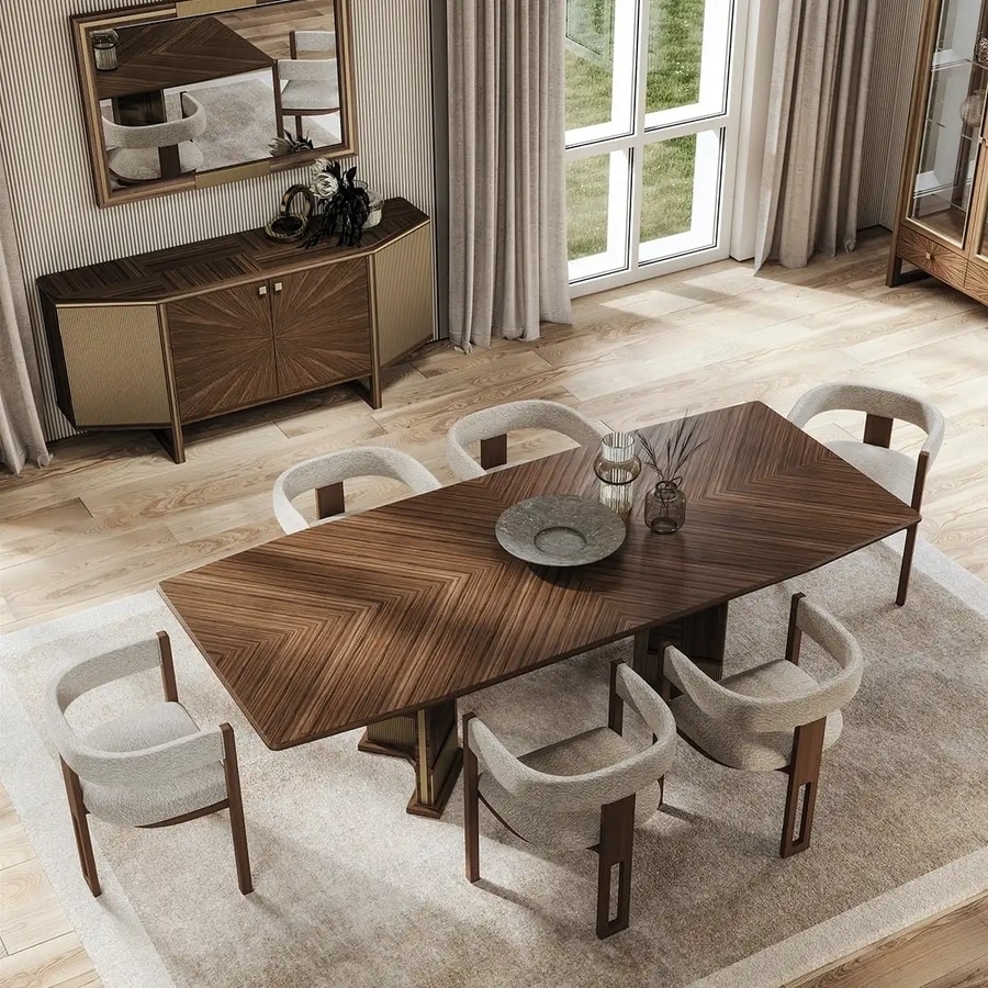 Avec ses lignes épurées et la texture chaleureuse du noyer Canaletto, cette table à manger devient le point central de chaque réunion, accueillant amis et famille dans une atmosphère de convivialité raffinée.