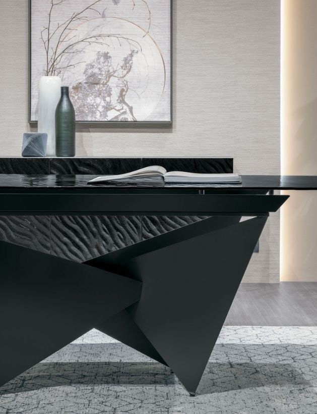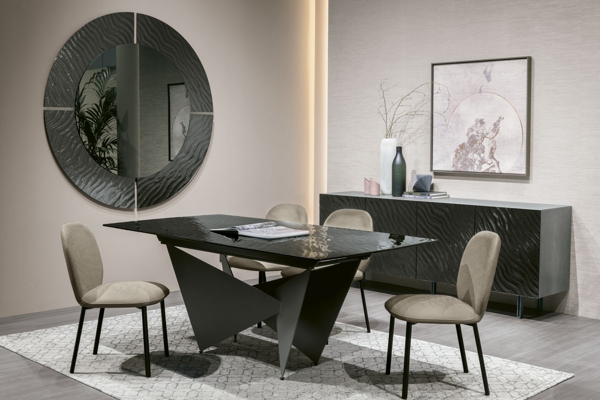 Disponible en versions fixe et extensible, Aliseo s’adapte aux différents espaces et occasions tout en conservant sa présence scénique. Le plateau peut être rectangulaire ou en forme de tonneau et est réalisé en céramique grès brillante, verre ondulé ou verre dunes, des finitions qui amplifient la lumière, les reflets et l’élégance. Polyvalent, sophistiqué et d’un fort impact visuel, Aliseo transforme chaque moment convivial en expérience de style.