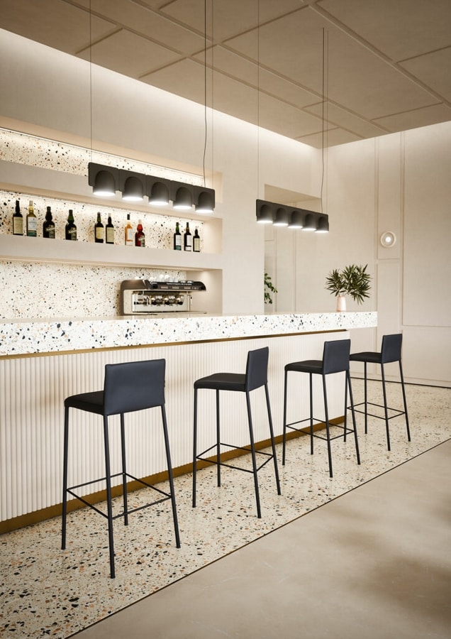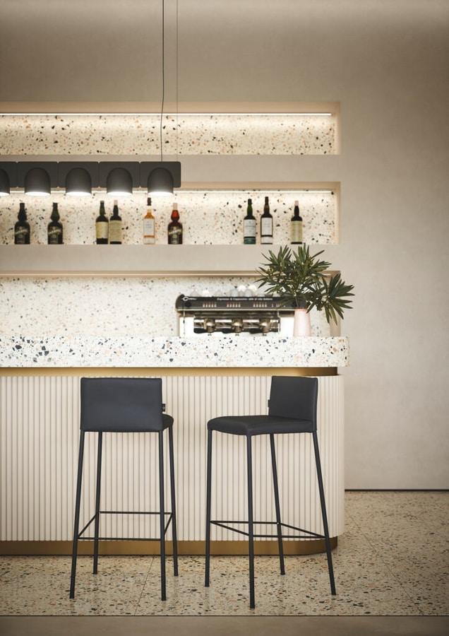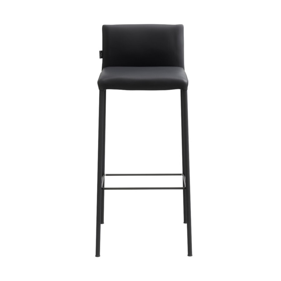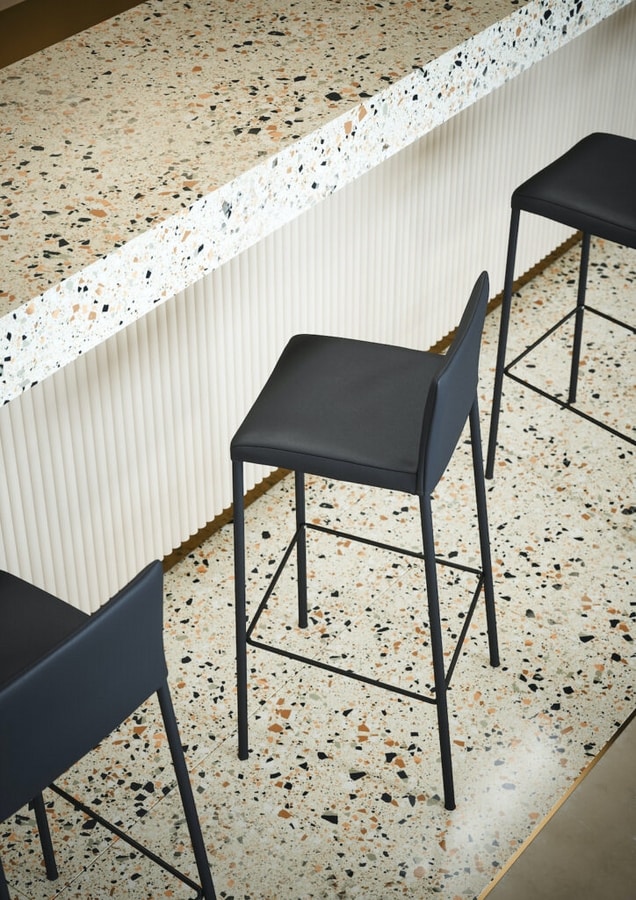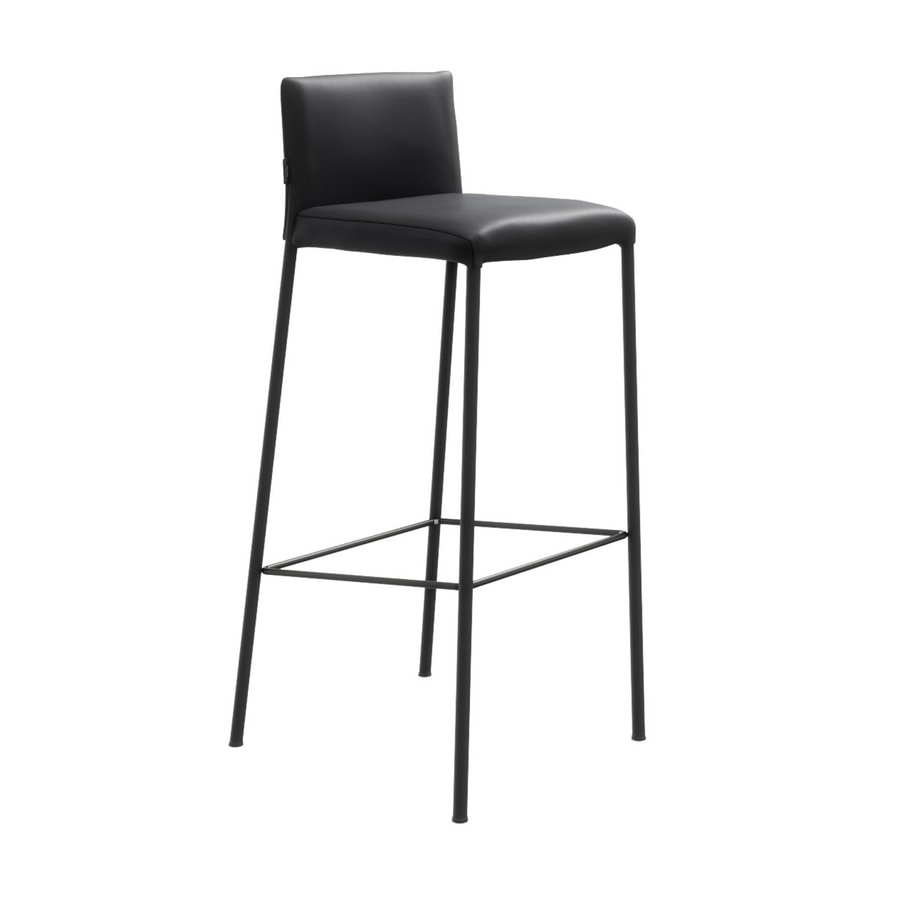 Le tabouret Manila est en métal, entièrement recouvert de tissu, de cuir ou d'éco-cuir.