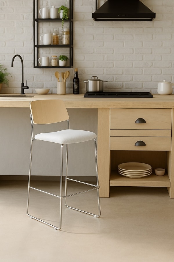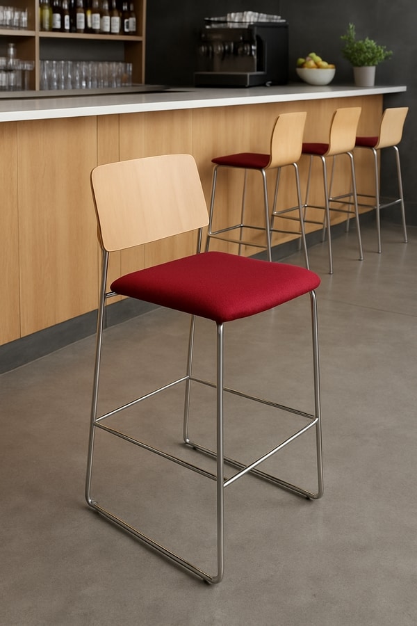 Tabouret empilable avec assise et dossier en contreplaqué de hêtre.
