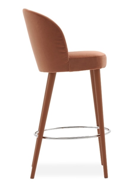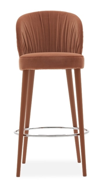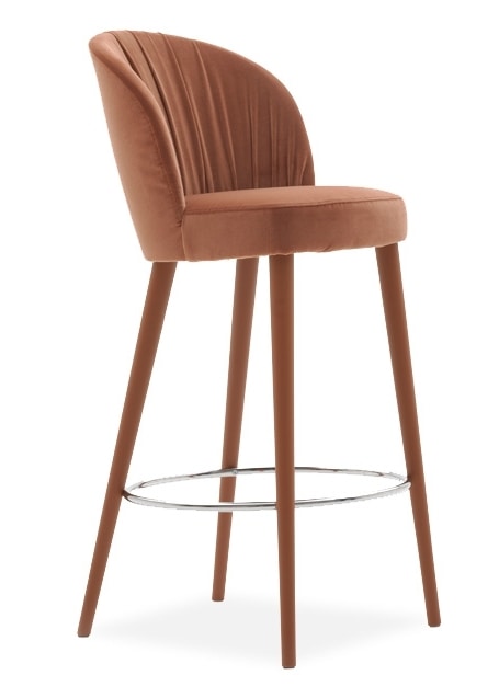 Tabouret, coquille en mousse. Siège ceinturé. Rembourré sur le cadre. Corps interne avec rembourrage plissé. Avec 4 pieds tournés en bois massif et rebord de repose-pieds chromé.