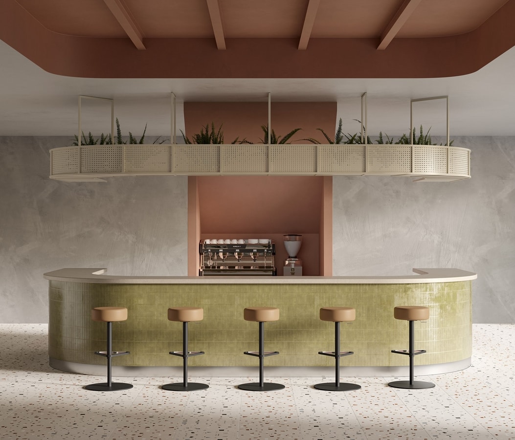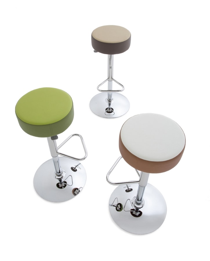 Tabourets avec assises garnies en differentes couleurs de tissu, avec pitements pivotants.