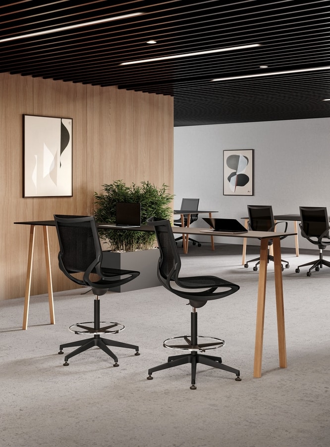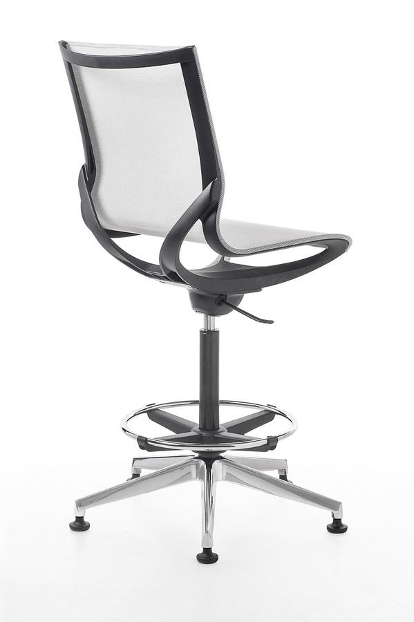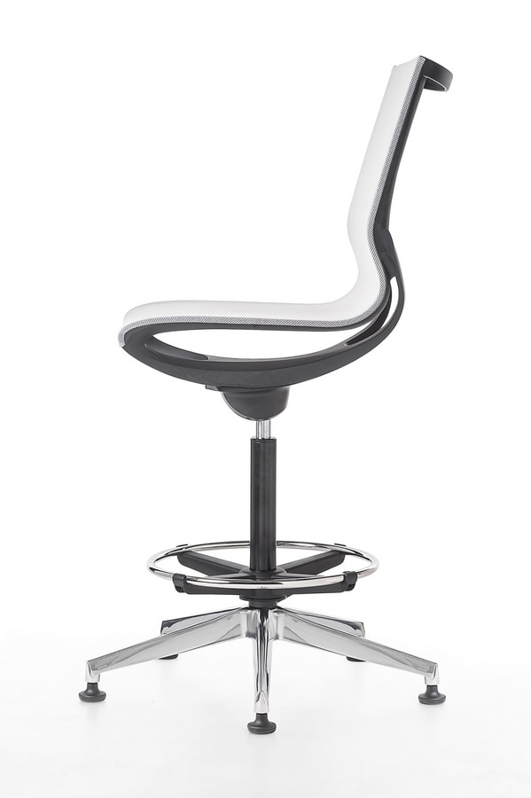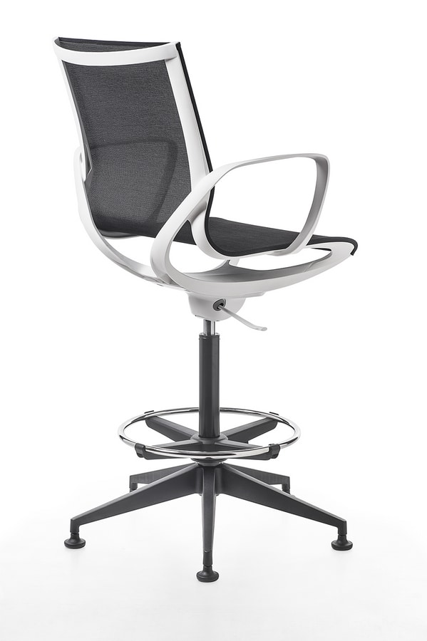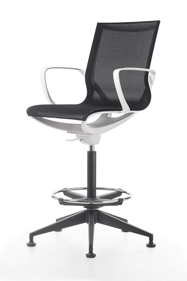 Tabouret, avec ou sans accoudoirs sur structure noire ou blanche. Disponible en résille dans les couleurs noir, beige, gris ou vert.