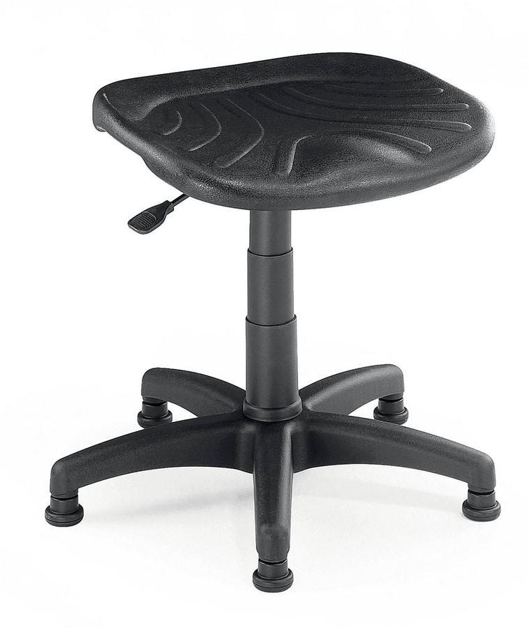 Tabouret bas réglable en hauteur avec vérin à gaz. Siège en polyuréthane noir.