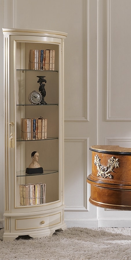 Meuble d'angle 1 porte avec 1 tiroir inférieur, finition laquée antique avec doré.