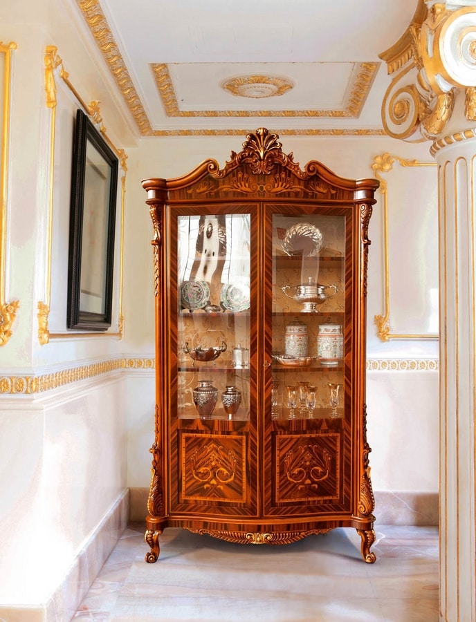 Vitrine en bois marqueté et sculpté. Equipé de 2 portes avec panneaux.
