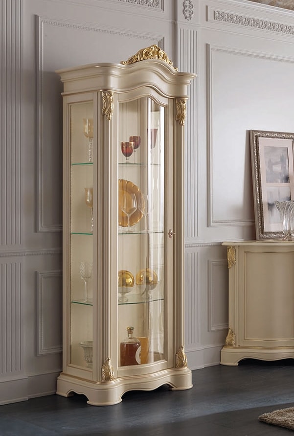 Vitrine avec 1 porte, tout en verre, avec des décorations sculptées en or. Étagères en verre internes.