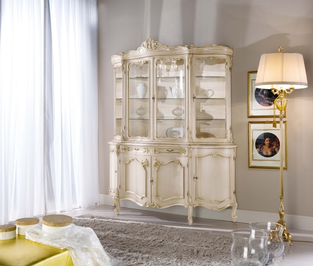 Vitrine avec étagères en cristal. Structure en bois laqué, avec des sculptures et des décorations en or.