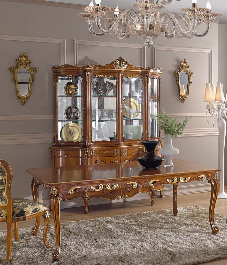 Vitrine avec étagères en cristal. Toile de fond miroir. Structure en bois, avec des sculptures et des décorations en or.