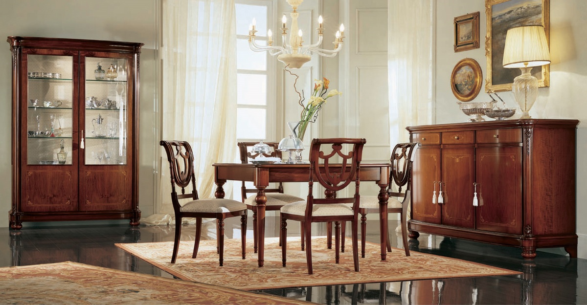 La collection Gardenia pour le salon est composé d'éléments de mobilier de style qui se distinguent par le soin et l'usinage de précision. Riche en détails qui améliorent et de grande solidité pour assurer la pérennité, la collection offre à côté d'un buffet précieux avec trois portes et trois tiroirs, une vitrine avec trois portes avec trois portes latérales avec des cristaux courbes ou avec deux portes toujours avec le verre incurvé. Tous deux sont équipés d'un éclairage intérieur. La collection comprend également deux types de tables - Place extensibles sur les côtés avec deux extensions intégrées, ou rectangulaires avec fixe - qui est accompagné par des chaises, avec ou sans accoudoirs, bois et tissu "Martinique 1".